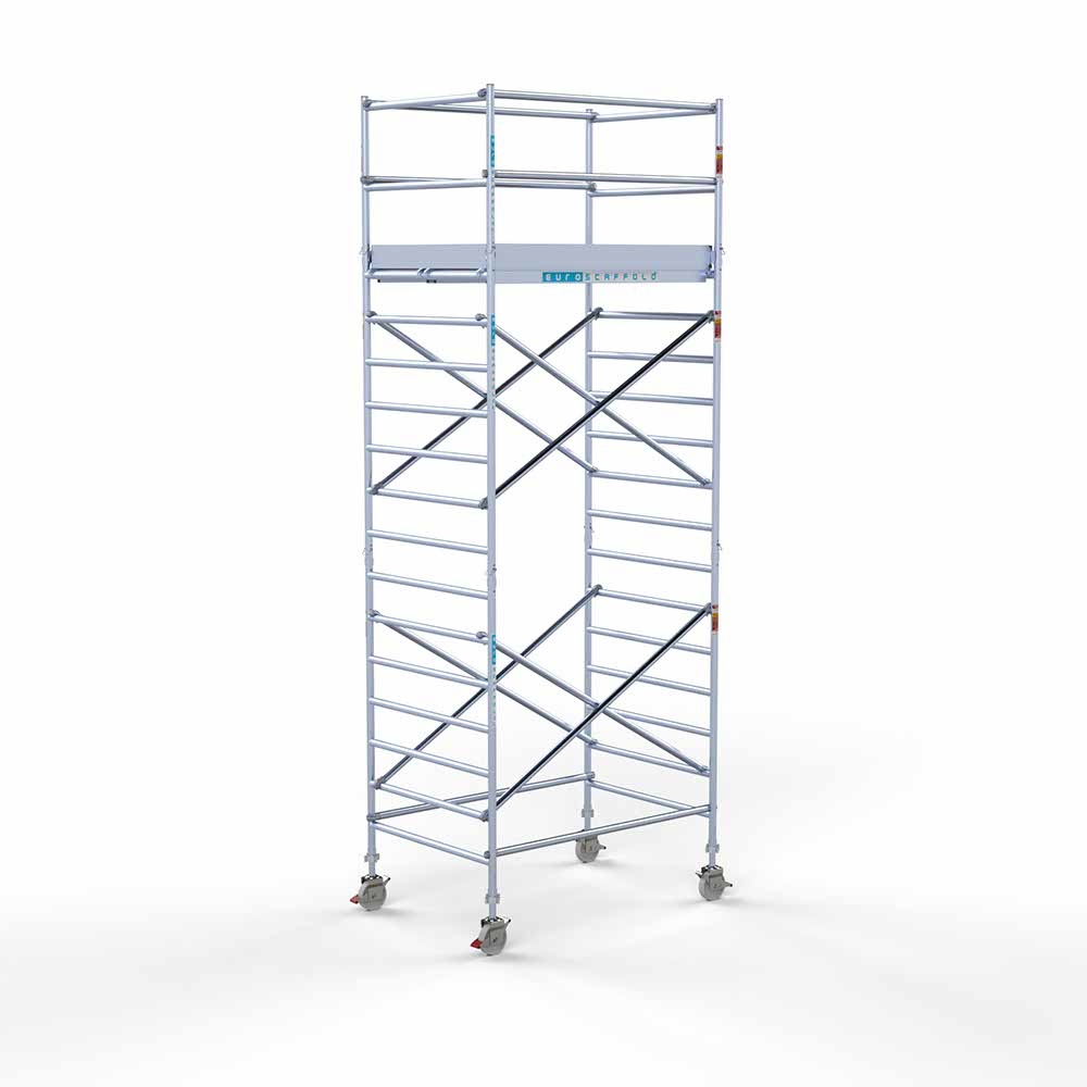 Kies de juiste werkhoogte voor uw rolsteiger. Werkhoogte wordt als volgt berekend: de hoogte van het hoogste platform plus de gemiddelde hoogte van de handen als een persoon met omhoog gestrekte armen werkt (hiervoor rekenen we 2 meter). De formule om de werkhoogte te berekenen is dus: platformhoogte + 2 meter.
