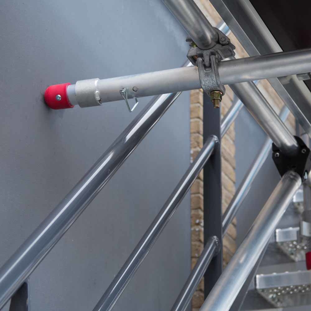 Aluminium afhouder t.b.v. de Euroscaffold trapgat steiger. Geleverd inclusief dubbele kruiskoppeling. De afhouder wordt bevestigd aan de horizontaal schoren. Beide uiteinden zijn voorzien van een rubberen coating om beschadigingen aan de trapleuning en muur te voorkomen.