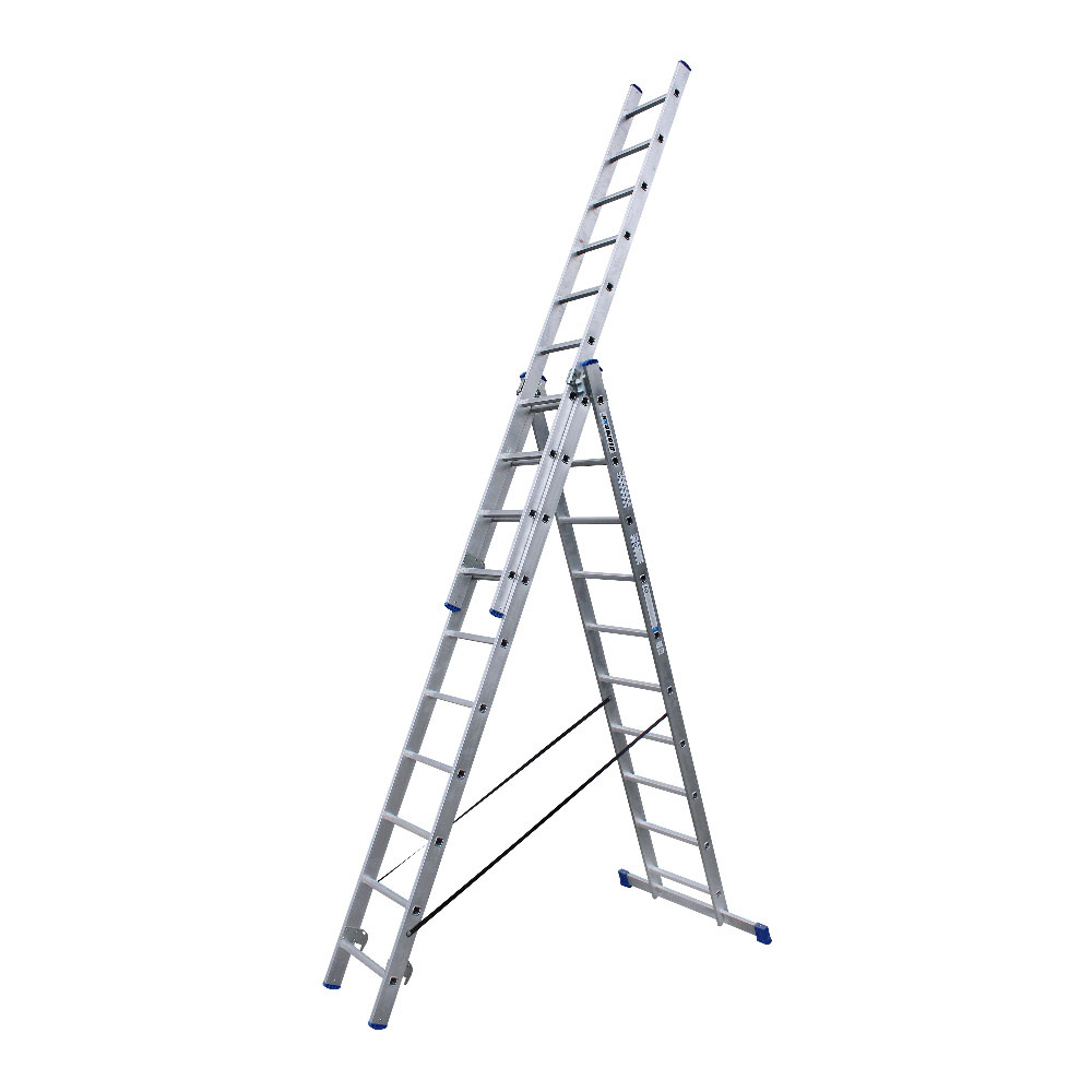 Een driedelige reformladder is een veelzijdige en veelgebruikte ladder, geschikt voor zowel professioneel als particulier gebruik. De term "driedelig" verwijst naar de drie afzonderlijke secties waaruit de ladder bestaat, waardoor deze flexibel en aanpasbaar is aan verschillende situaties. Een belangrijke eigenschap van de reformladder is dat deze op meerdere manieren gebruikt kan worden: als opsteekladder (in zijn volledige lengte), als A-ladder (vrijstaand), en in sommige gevallen zelfs als een schuifladder.