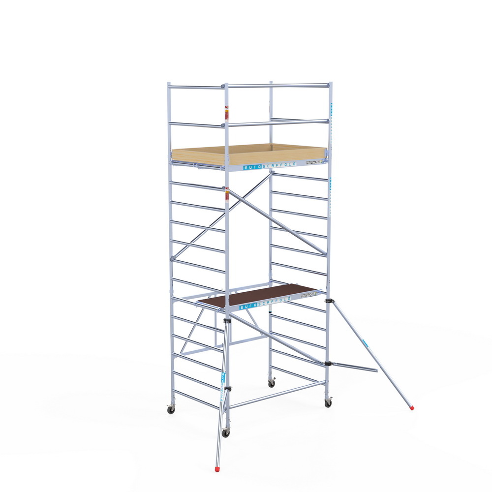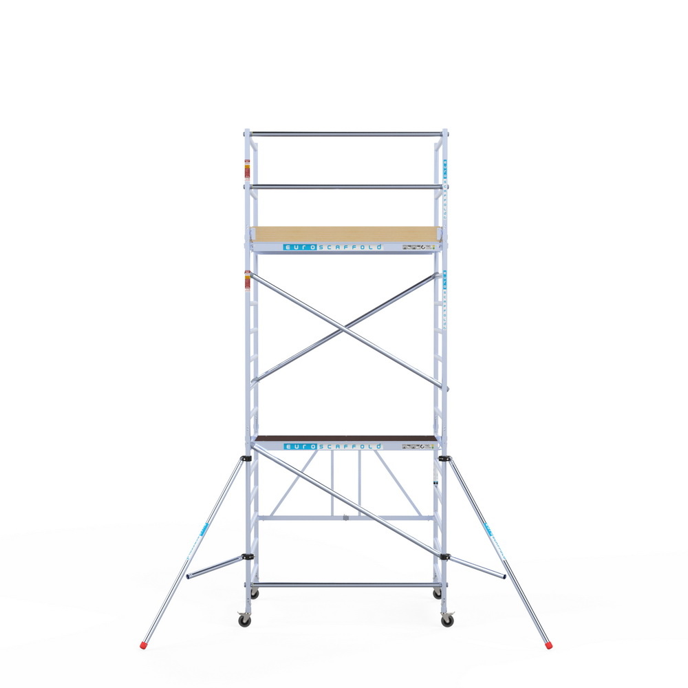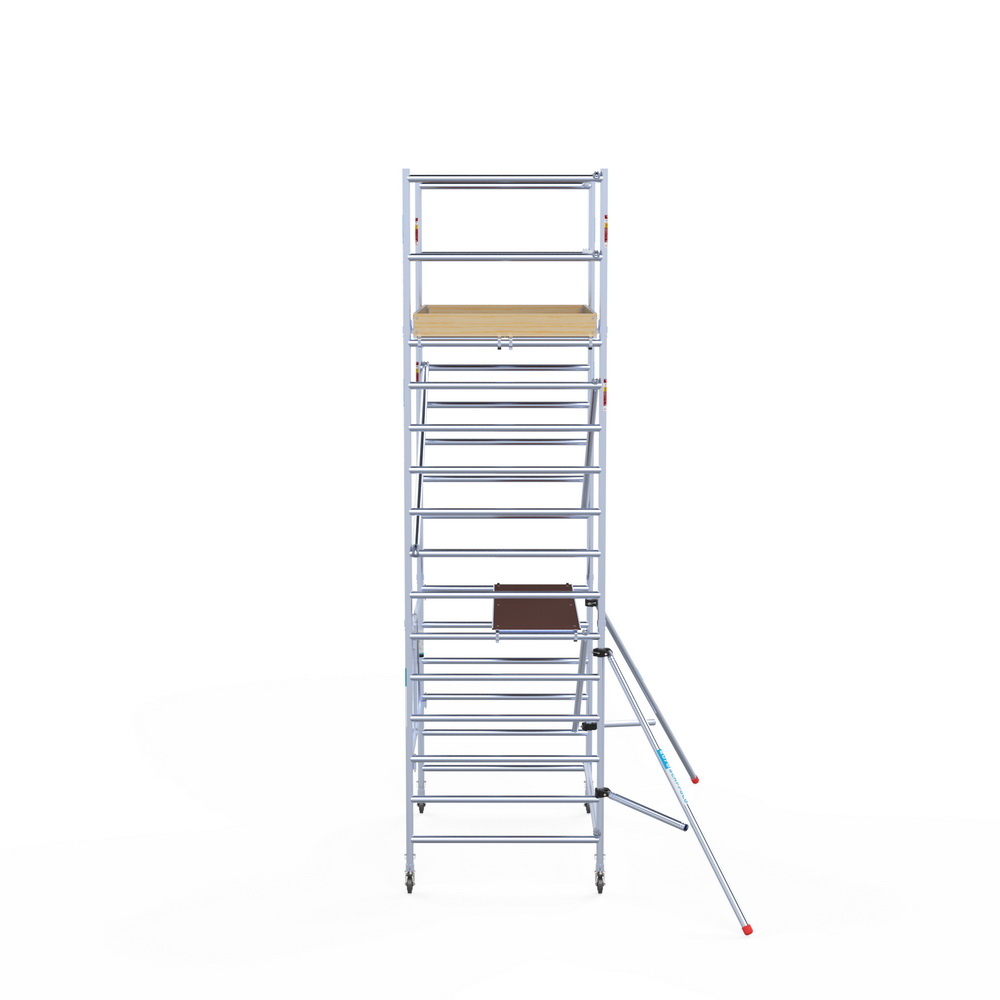 Kies de juiste werkhoogte voor uw rolsteiger. Werkhoogte wordt als volgt berekend: de hoogte van het hoogste platform plus de gemiddelde hoogte van de handen als een persoon met omhoog gestrekte armen werkt (hiervoor rekenen we 2 meter). De formule om de werkhoogte te berekenen is dus: platformhoogte + 2 meter.