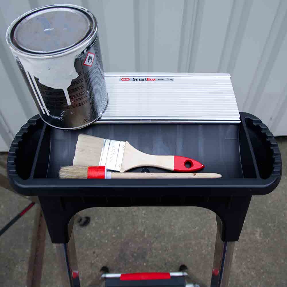 De trap is uitgerust met handige extra's, zoals een SmartBox gereedschapsbakje geïntegreerd in de trap. Leg hier uw kwast, schroevendraaier of schoonmaakmiddelen, zoals een doekje of spons in. Daarnaast beschikt de trap over een emmer haak, hang hier de verfpot of emmer met reinigingsmiddel aan op. Zo heeft u alle benodigdheden altijd bij de hand.