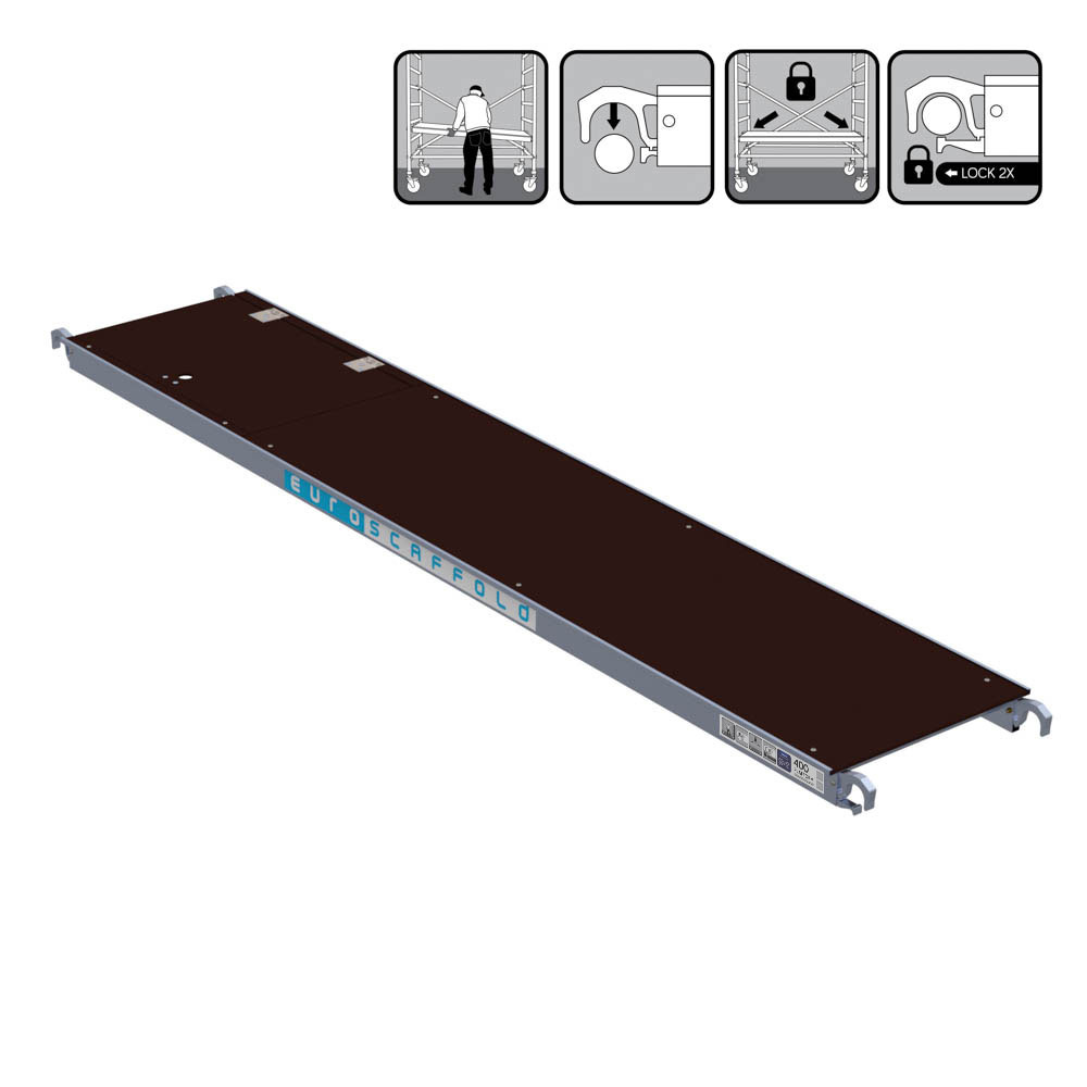 Op zoek naar een extra loopdek voor uw steiger? Dit Euroscaffold platform met luik is 400 cm lang en te gebruiken voor diverse merken rolsteigers.