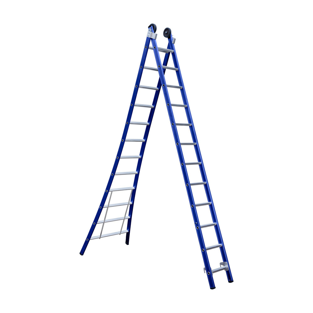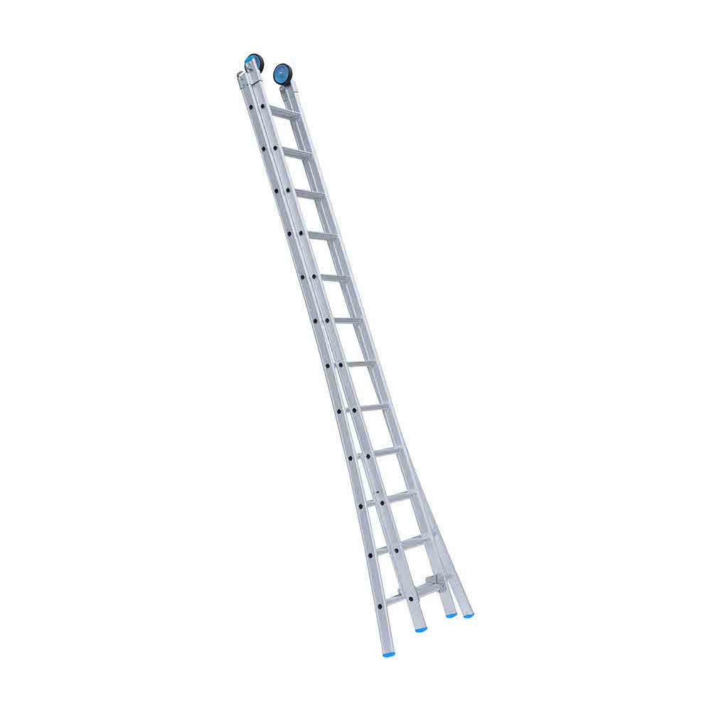 Professionele tweedelige reformladder 2x12 sporten van Eurostairs dubbel uitgebogen. Voldoet aan alle normeringen, zoals de EN 131, Warenwet en Arbowet. De ladder staat extra stabiel dankzij de uitgebogen bomen, stabilisatiebalk niet nodig.