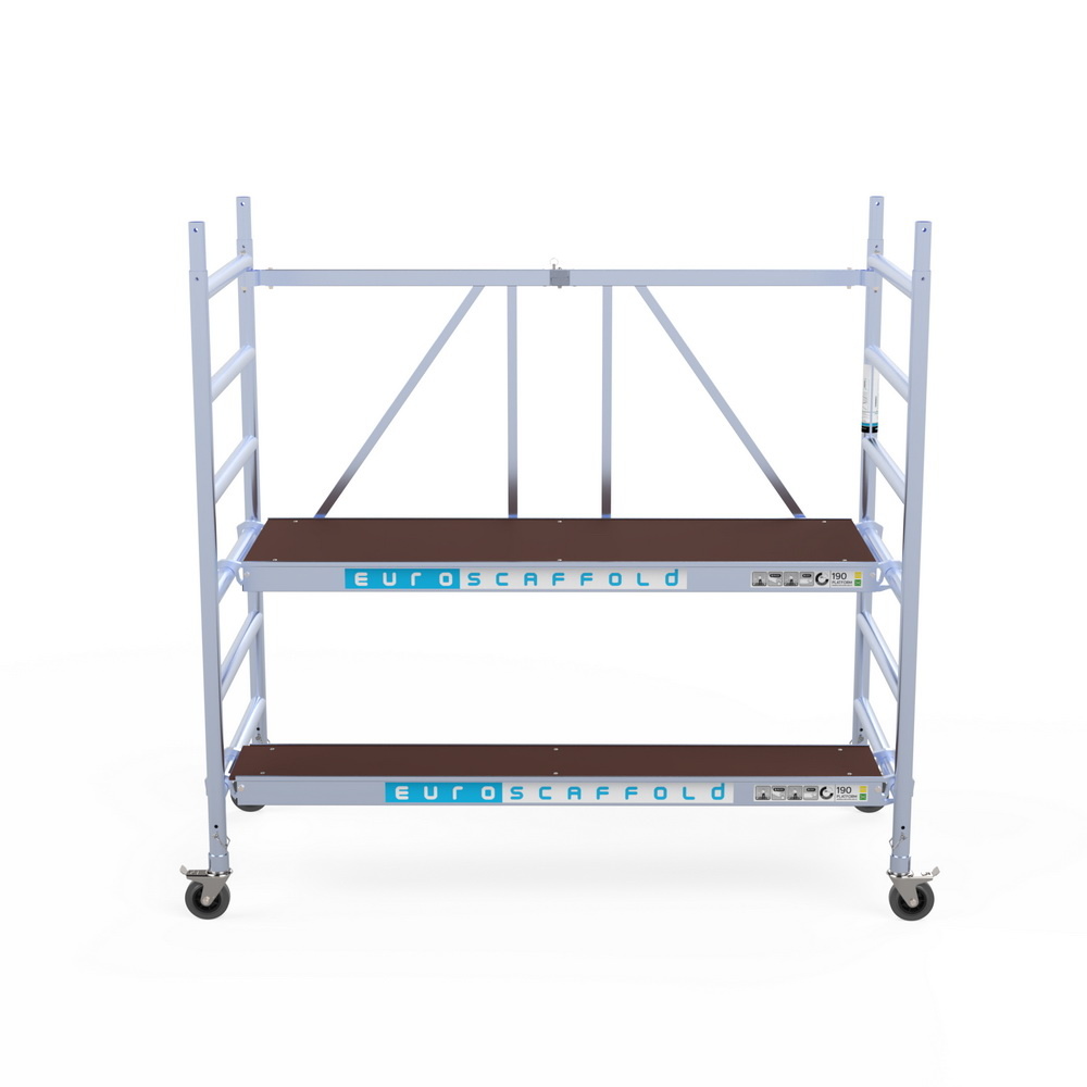 De gebruiksvriendelijke en compacte kamersteiger van Euroscaffold is geschikt voor professioneel gebruik binnen- en buitenshuis. De lichtgewicht steiger is veilig in gebruik en gemakkelijk te verplaatsen. Met het extra platform van 30 cm kunt u gemakkelijk opstappen naar het platform erboven. De steiger is vervaardigd van hoogwaardig aluminium en de sporten zijn uitgerust met een antislipprofiel. Het platform is voorzien van een gelast aluminium frame met watervast multiplex en een antisliplaag. De kamersteiger kan worden uitgebreid met een extra opzetstuk van 90 cm breed voor een hogere werkhoogte. De steiger voldoet aan de wettelijke normen en eisen voor professioneel gebruik.