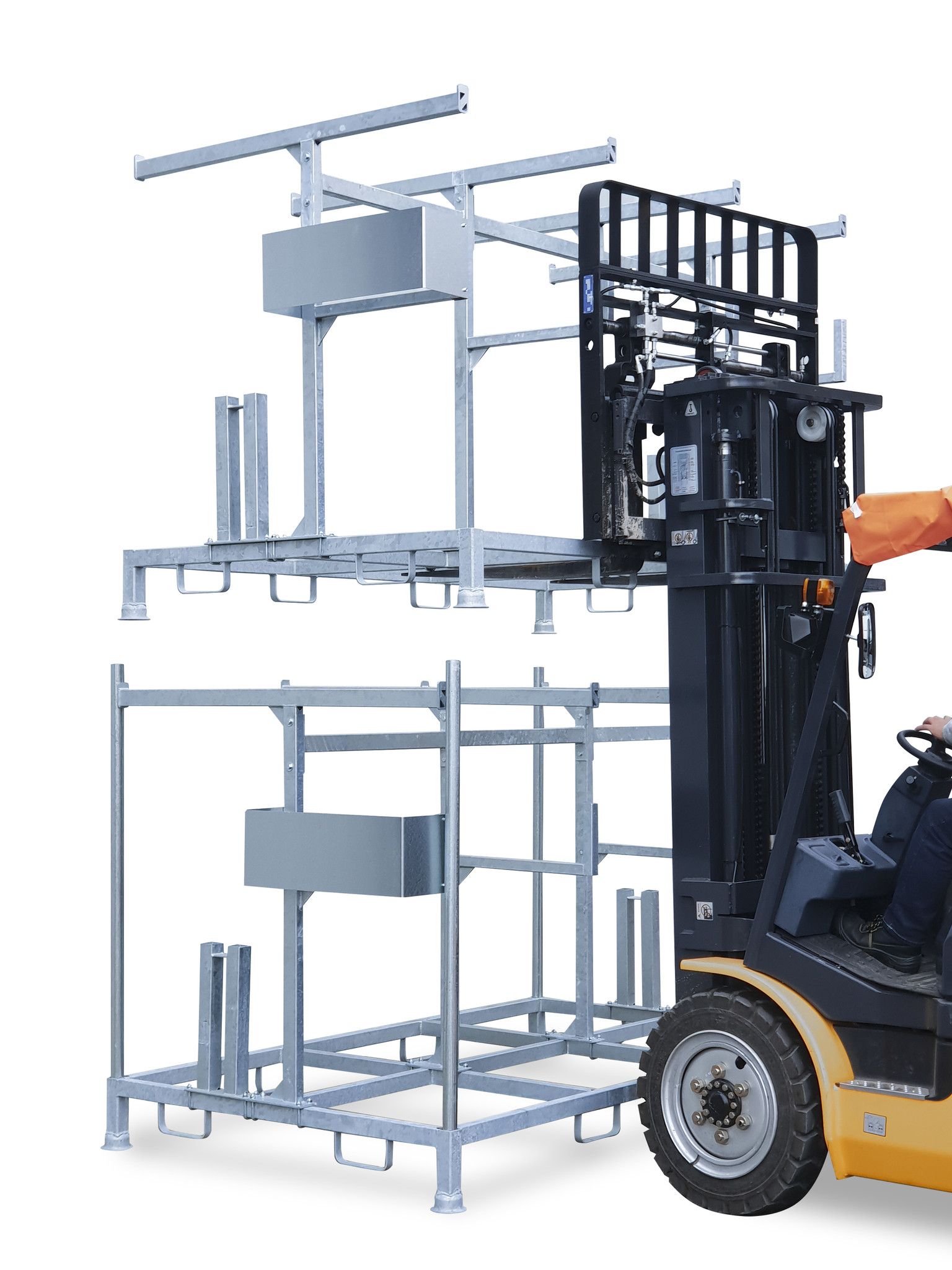 Stapel meerdere steigerbokken op elkaar met deze koppelbuizen. Handig bij opslag en/of vervoer van meerdere steigerbokken inclusief rolsteiger.