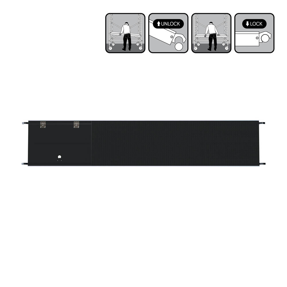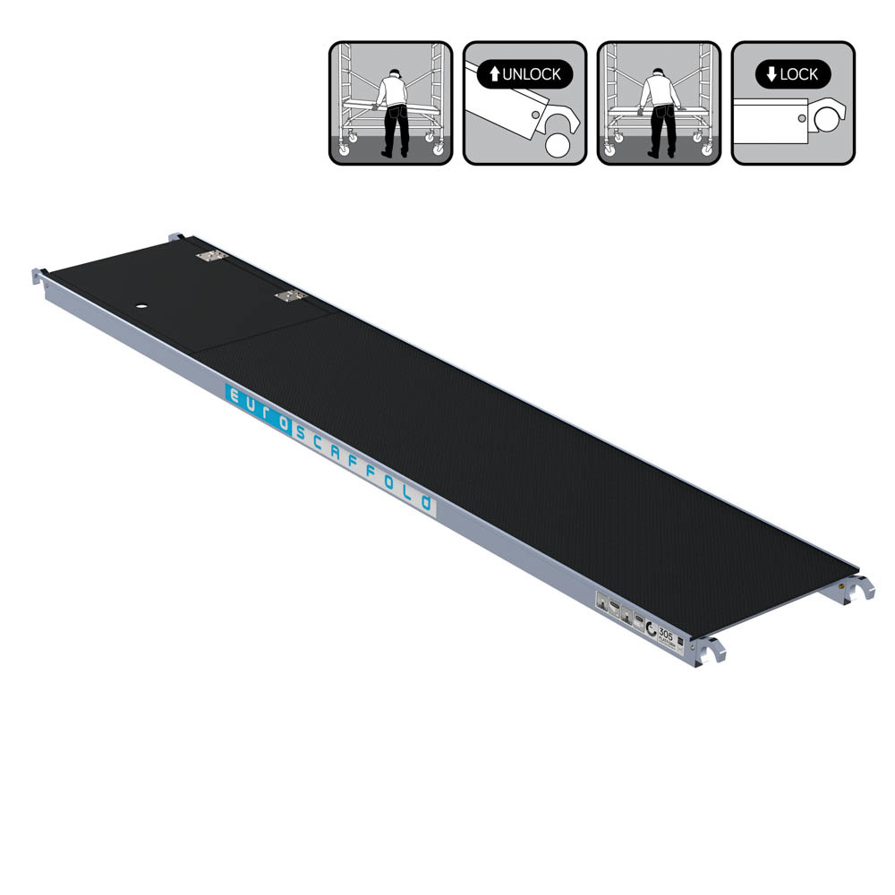 Deze lichtgewicht rolsteigervloer met luik is gemaakt van kunststof carbondeck. Het platform is 400 cm lang, 60 cm breed en weegt slechts 21 kg. Een rolsteigervloer van carbondeck is zo€™n 30% minder zwaar dan een platform van hout. Met lichtgewicht platformen kunt u uw steigers sneller opbouwen en gemakkelijker verplaatsen. De platformen zijn vrijwel onverwoestbaar en hebben een hogere belastbaarheid van 250 kg per m². Door het luik in de vloer kunt u aan de binnenkant van de steiger veilig binnendoor klimmen. De steigervloeren van Euroscaffold zijn uitwisselbaar met andere merken, en voldoen aan de Nederlandse en Europese wetgeving.