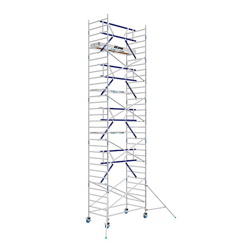 Kies de juiste werkhoogte voor uw rolsteiger. Werkhoogte wordt als volgt berekend: de hoogte van het hoogste platform plus de gemiddelde hoogte van de handen als een persoon met omhoog gestrekte armen werkt (hiervoor rekenen we 2 meter). De formule om de werkhoogte te berekenen is dus: platformhoogte + 2 meter.