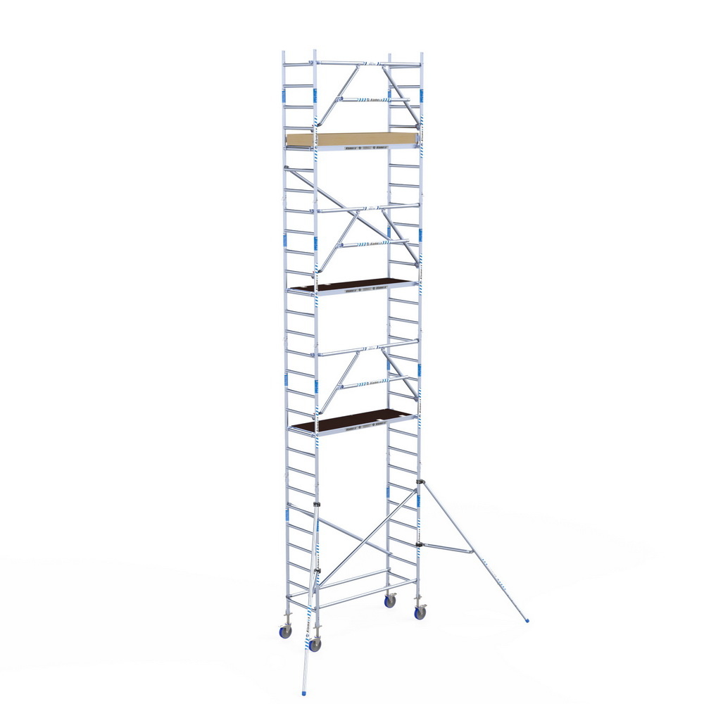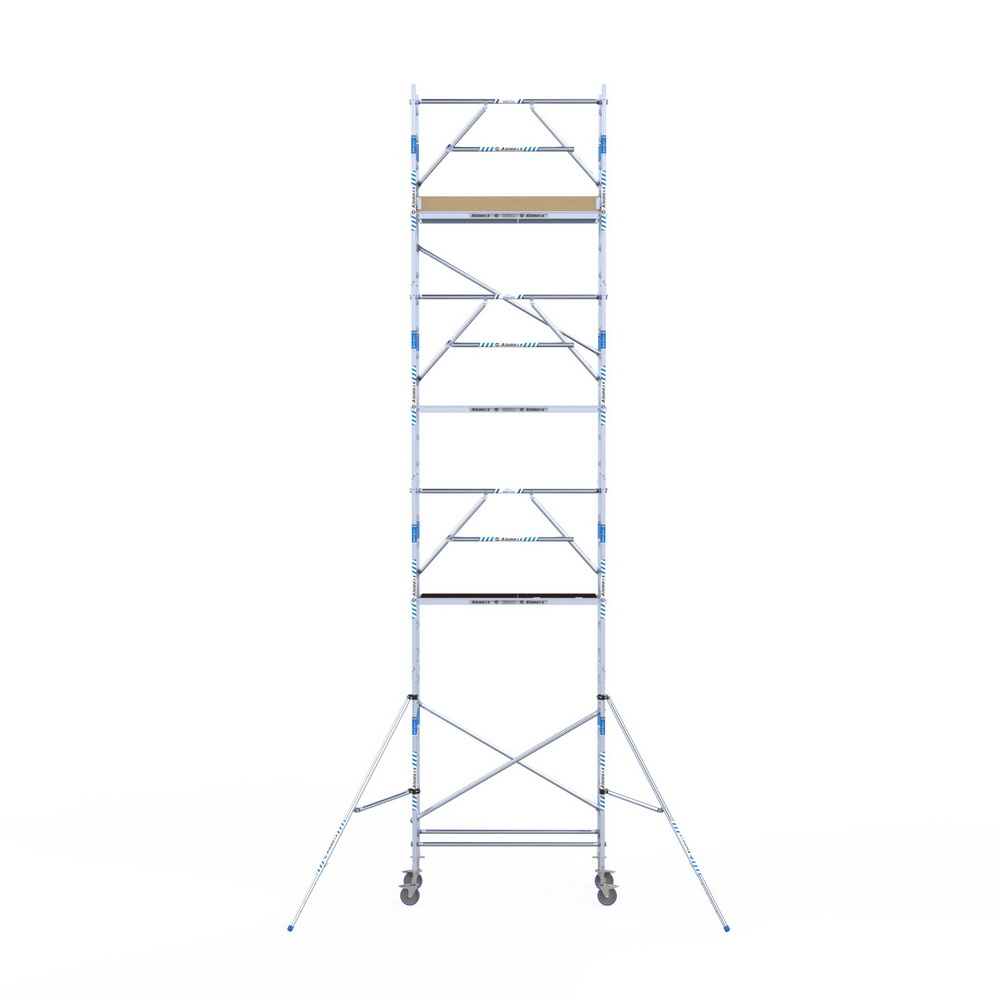 Semi-professionele rolsteiger 'Extra' van Alumexx voorzien van voorloopleuningen voor het veilig opbouwen en gebruiken van de steiger. Smalle rolsteigers van 75 centimeter breed zijn compact en ideaal voor werken in beperkte ruimtes en smalle doorgangen.
