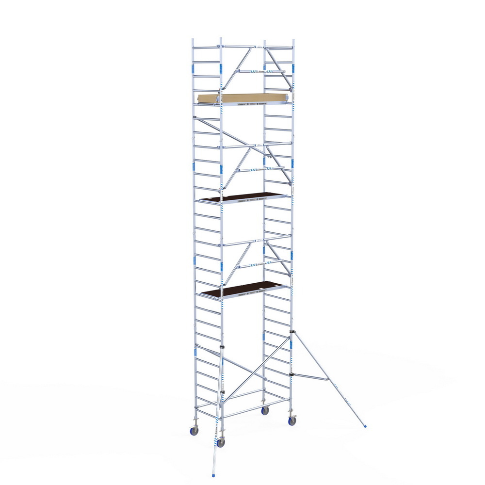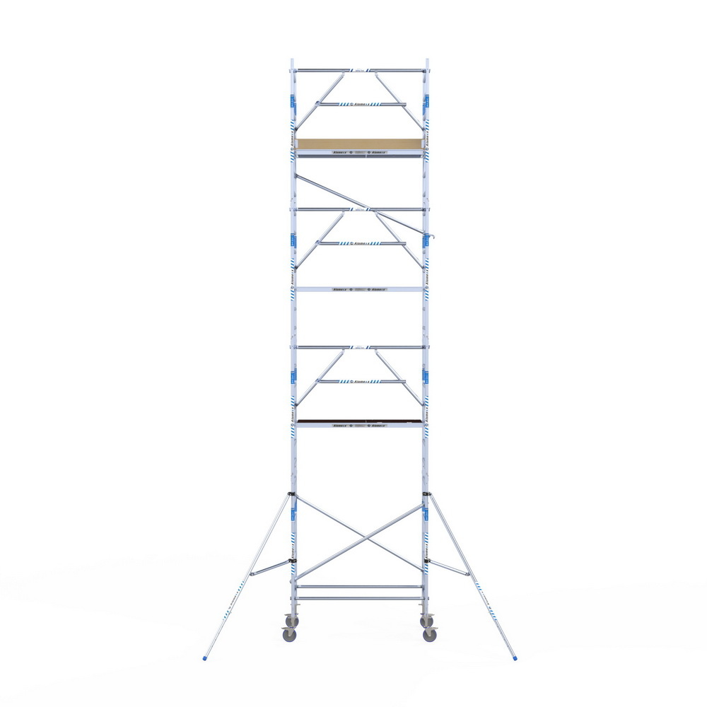 Kies de juiste werkhoogte voor uw rolsteiger. Werkhoogte wordt als volgt berekend: de hoogte van het hoogste platform plus de gemiddelde hoogte van de handen als een persoon met omhoog gestrekte armen werkt (hiervoor rekenen we 2 meter). De formule om de werkhoogte te berekenen is dus: platformhoogte + 2 meter.