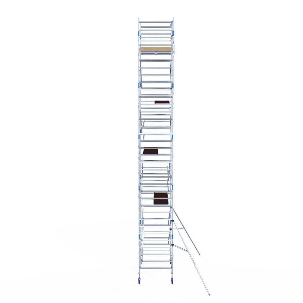Kies de juiste werkhoogte voor uw rolsteiger. Werkhoogte wordt als volgt berekend: de hoogte van het hoogste platform plus de gemiddelde hoogte van de handen als een persoon met omhoog gestrekte armen werkt (hiervoor rekenen we 2 meter). De formule om de werkhoogte te berekenen is dus: platformhoogte + 2 meter.