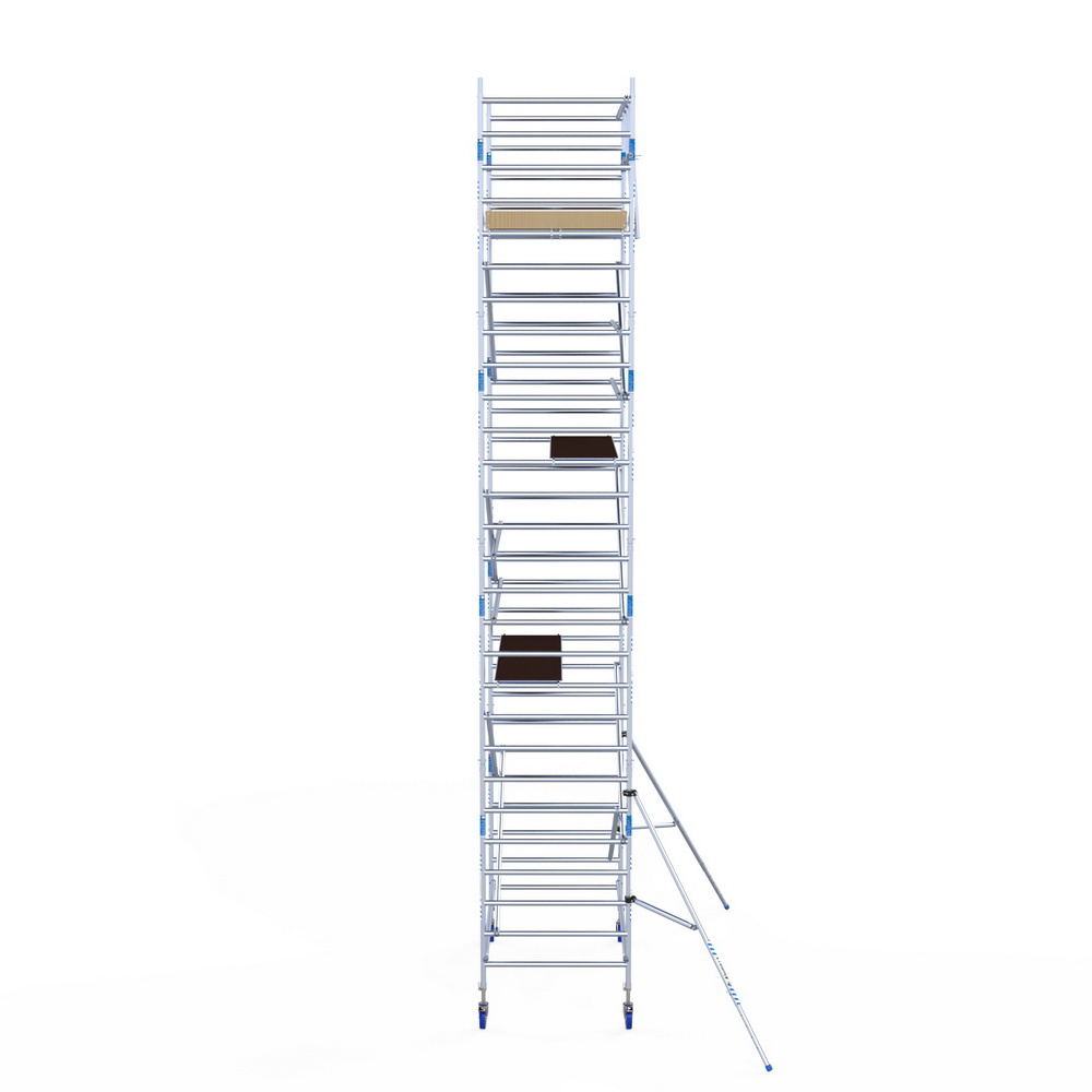Kies de juiste werkhoogte voor uw rolsteiger. Werkhoogte wordt als volgt berekend: de hoogte van het hoogste platform plus de gemiddelde hoogte van de handen als een persoon met omhoog gestrekte armen werkt (hiervoor rekenen we 2 meter). De formule om de werkhoogte te berekenen is dus: platformhoogte + 2 meter.