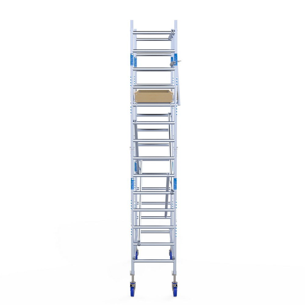 Rolsteiger Alumexx 'Light' voorzien van schoren met bovenin een voorloopleuning als valbeveiliging en voor het veilig opbouwen van de steiger. Deze rolsteiger is van alle gemakken voorzien: kwaliteit, betrouwbaar, stabiel en een zeer lange levensduur.