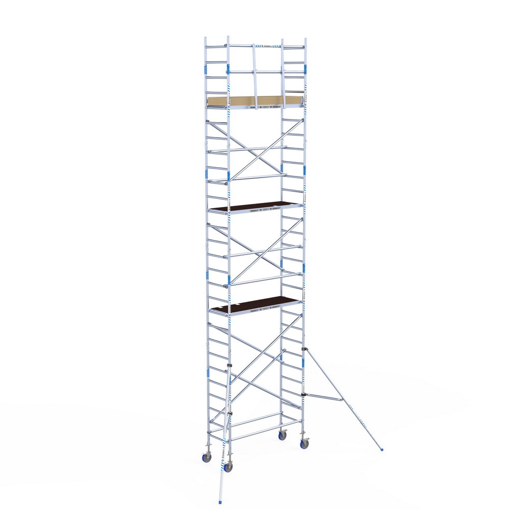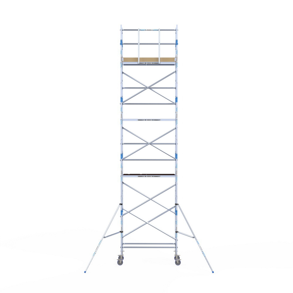 Rolsteiger Alumexx 'Light' voorzien van schoren met bovenin een voorloopleuning als valbeveiliging en voor het veilig opbouwen van de steiger. Deze rolsteiger is van alle gemakken voorzien: kwaliteit, betrouwbaar, stabiel en een zeer lange levensduur.