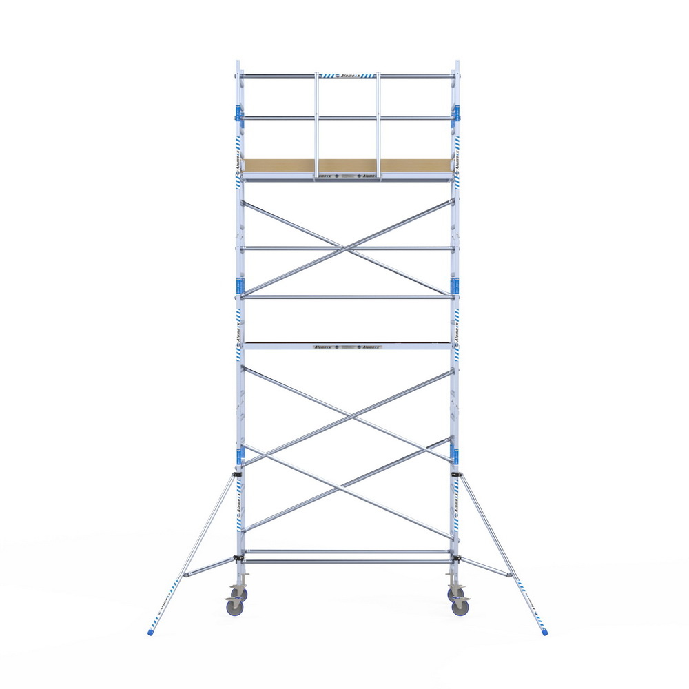 Rolsteiger Alumexx 'Light' voorzien van schoren met bovenin een voorloopleuning als valbeveiliging en voor het veilig opbouwen van de steiger. Deze rolsteiger is van alle gemakken voorzien: kwaliteit, betrouwbaar, stabiel en een zeer lange levensduur.