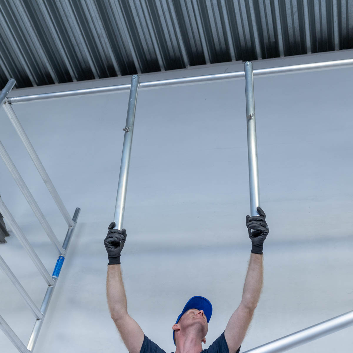 Kies de juiste werkhoogte voor uw rolsteiger. Werkhoogte wordt als volgt berekend: de hoogte van het hoogste platform plus de gemiddelde hoogte van de handen als een persoon met omhoog gestrekte armen werkt (hiervoor rekenen we 2 meter). De formule om de werkhoogte te berekenen is dus: platformhoogte + 2 meter.