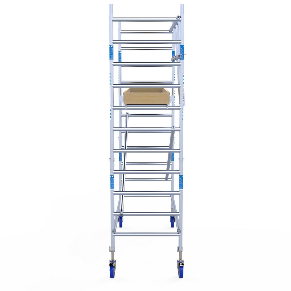 Kies de juiste werkhoogte voor uw rolsteiger. Werkhoogte wordt als volgt berekend: de hoogte van het hoogste platform plus de gemiddelde hoogte van de handen als een persoon met omhoog gestrekte armen werkt (hiervoor rekenen we 2 meter). De formule om de werkhoogte te berekenen is dus: platformhoogte + 2 meter.