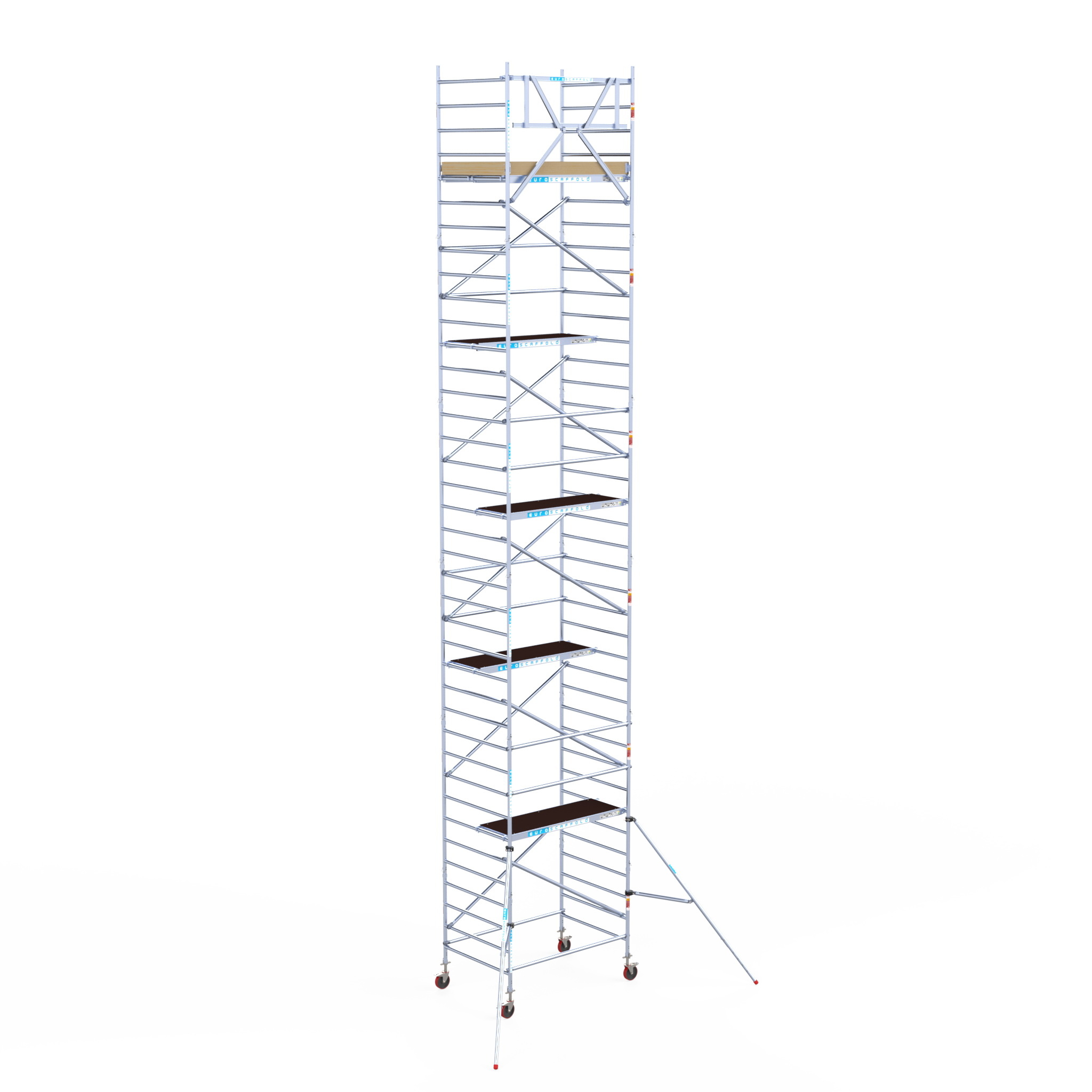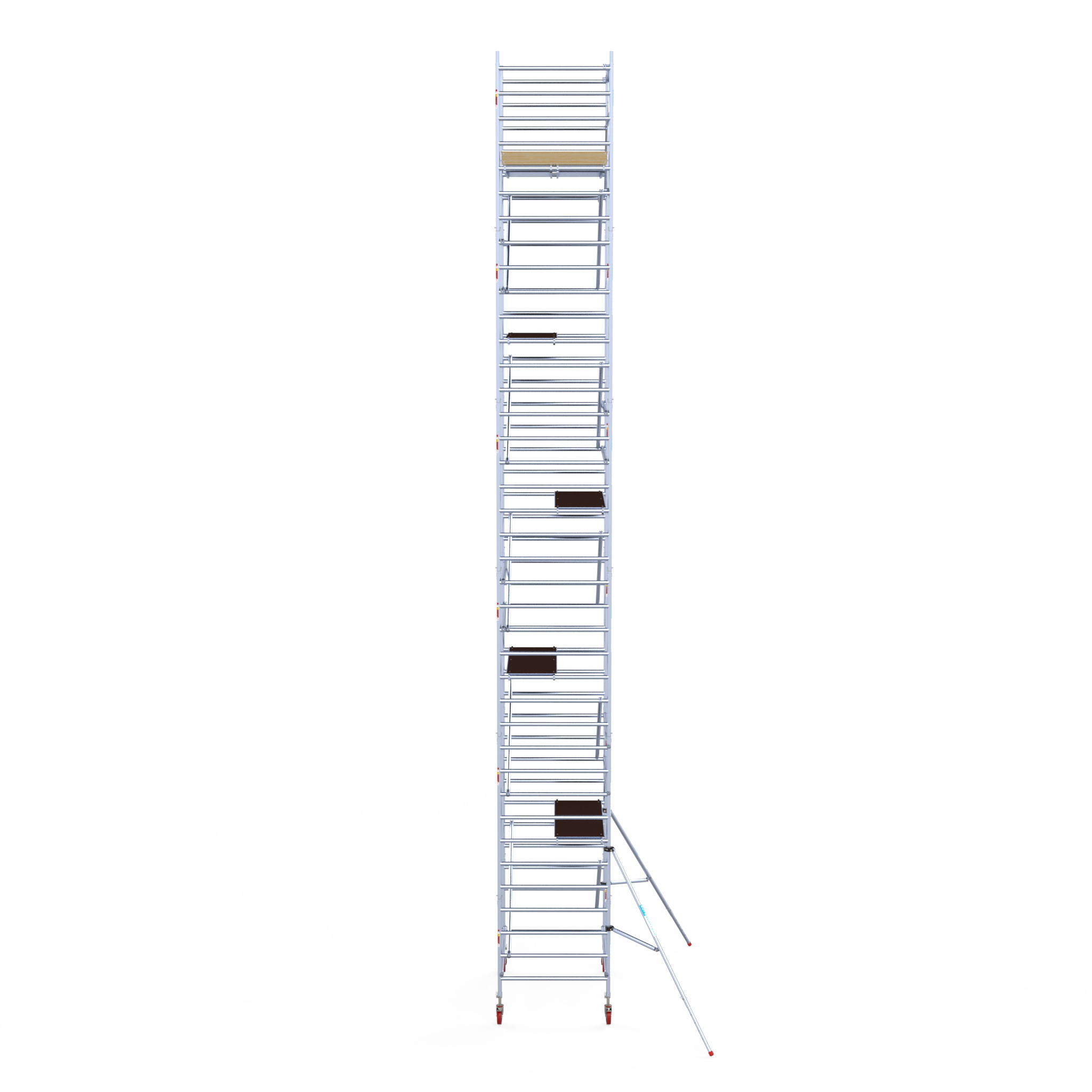 Hoge Basic rolsteiger met een afmeting van 135 cm x 190 cm en 12,2 meter werkhoogte. Met 5 platforms, dit biedt de mogelijkheid om met meerdere mensen tegelijk op verschillende hoogtes te werken. Zeer stabiel door het robuuste design.