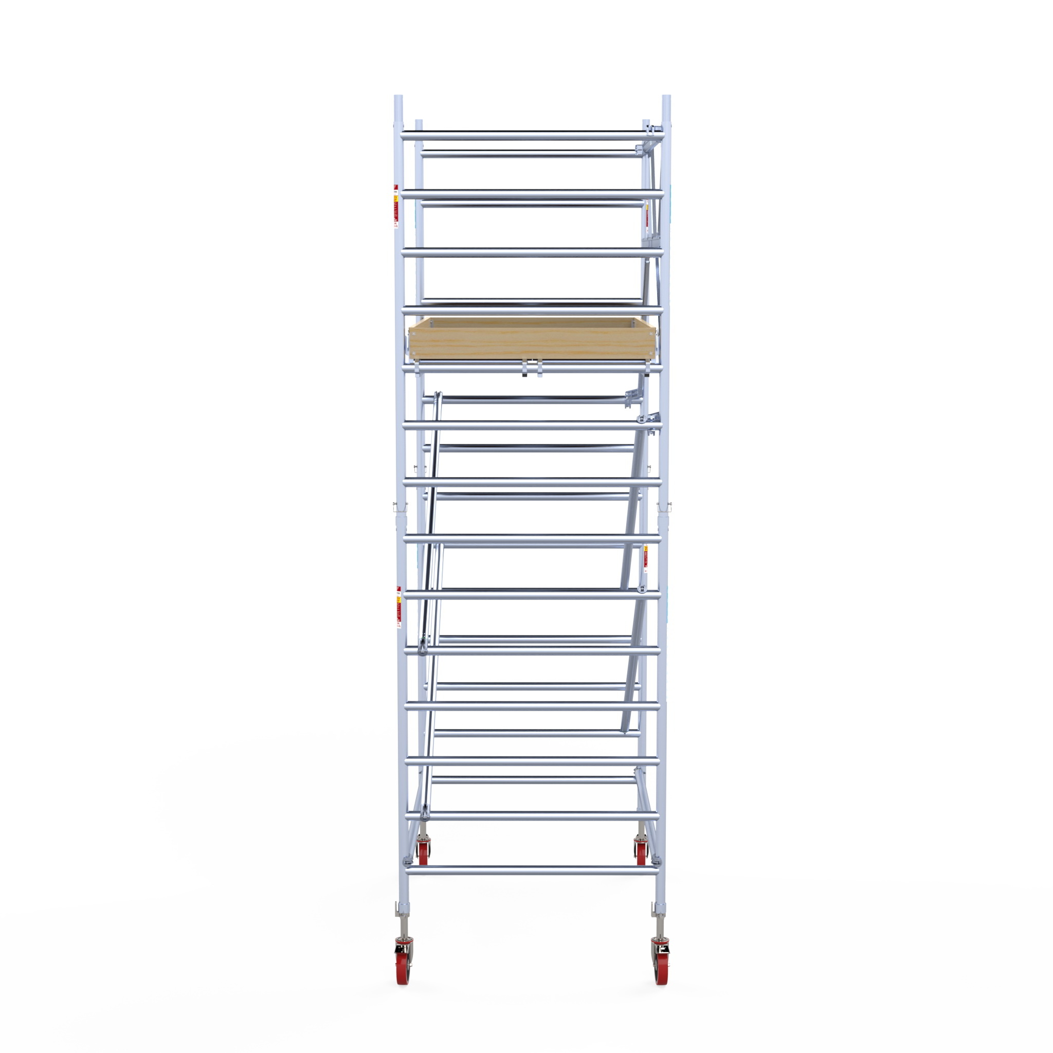 Kies de juiste werkhoogte voor uw rolsteiger. Werkhoogte wordt als volgt berekend: de hoogte van het hoogste platform plus de gemiddelde hoogte van de handen als een persoon met omhoog gestrekte armen werkt (hiervoor rekenen we 2 meter). De formule om de werkhoogte te berekenen is dus: platformhoogte + 2 meter.