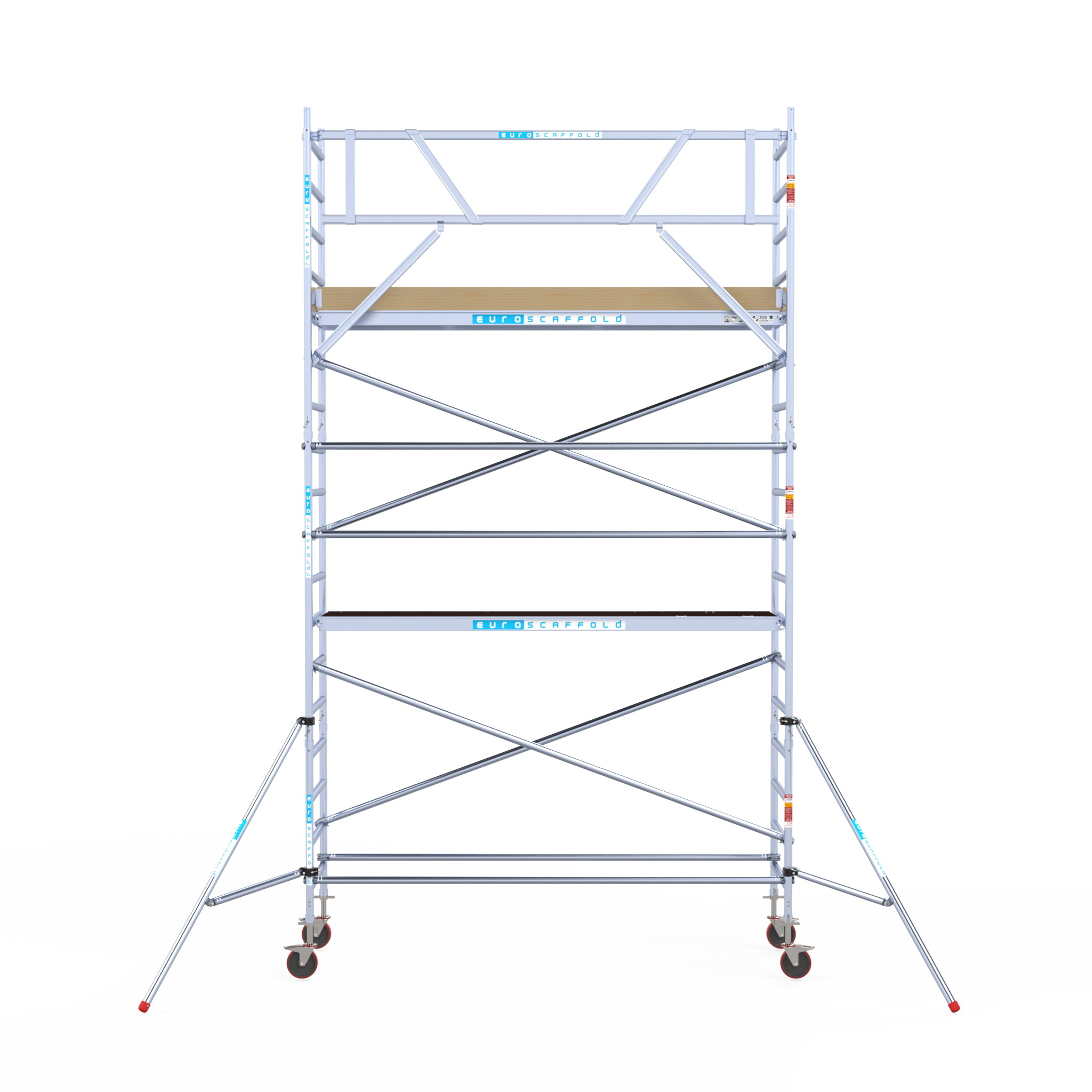 Deze aluminium rolsteiger 90 x 305 x 6,2 meter komt van pas zodra u op zoek bent naar een steiger met een werkhoogte van 6,2 meter. Het extra lange platformoppervlak zorgt dat u de rolsteiger minder vaak hoeft te verplaatsen.