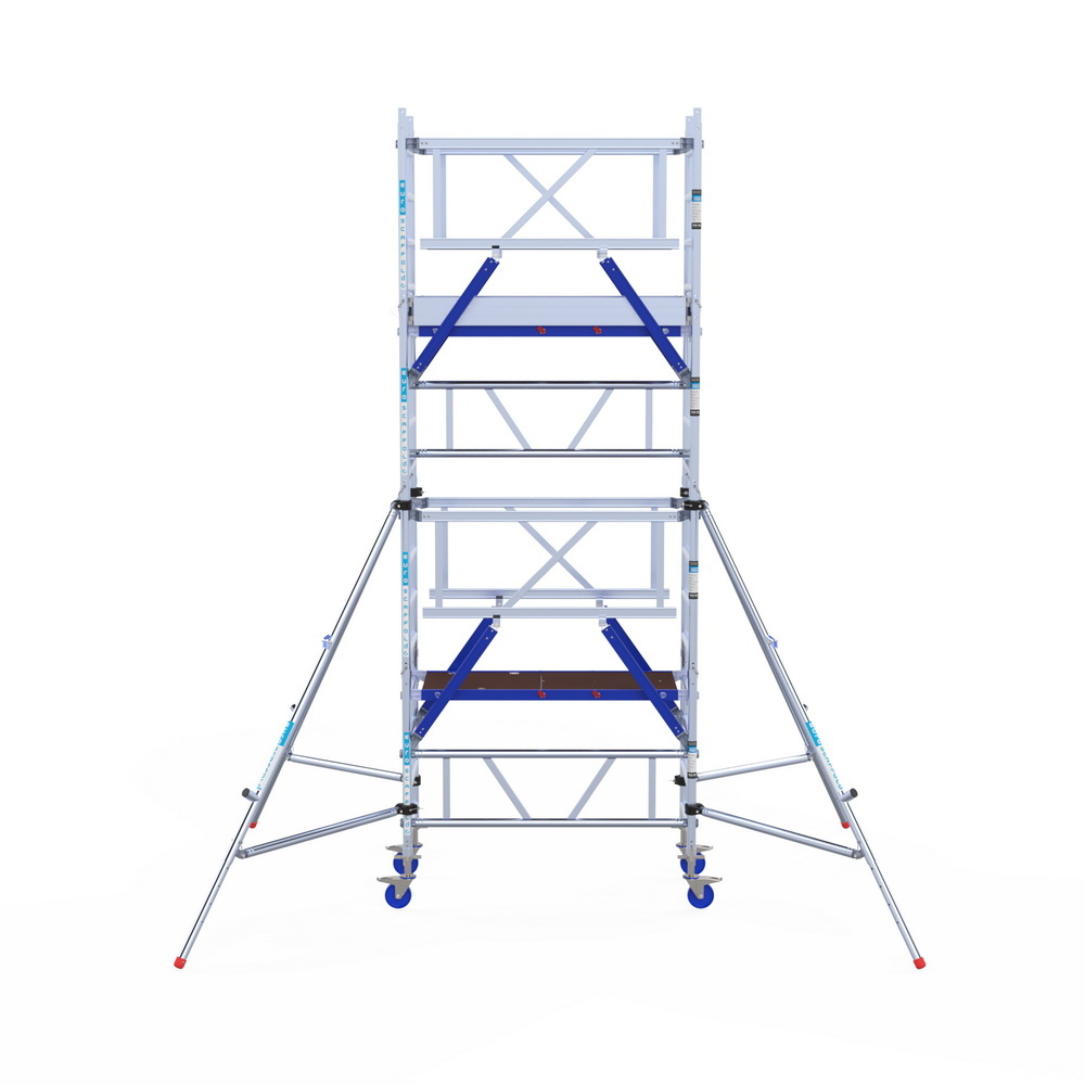 Kies de juiste werkhoogte voor uw rolsteiger. Werkhoogte wordt als volgt berekend: de hoogte van het hoogste platform plus de gemiddelde hoogte van de handen als een persoon met omhoog gestrekte armen werkt (hiervoor rekenen we 2 meter). De formule om de werkhoogte te berekenen is dus: platformhoogte + 2 meter.