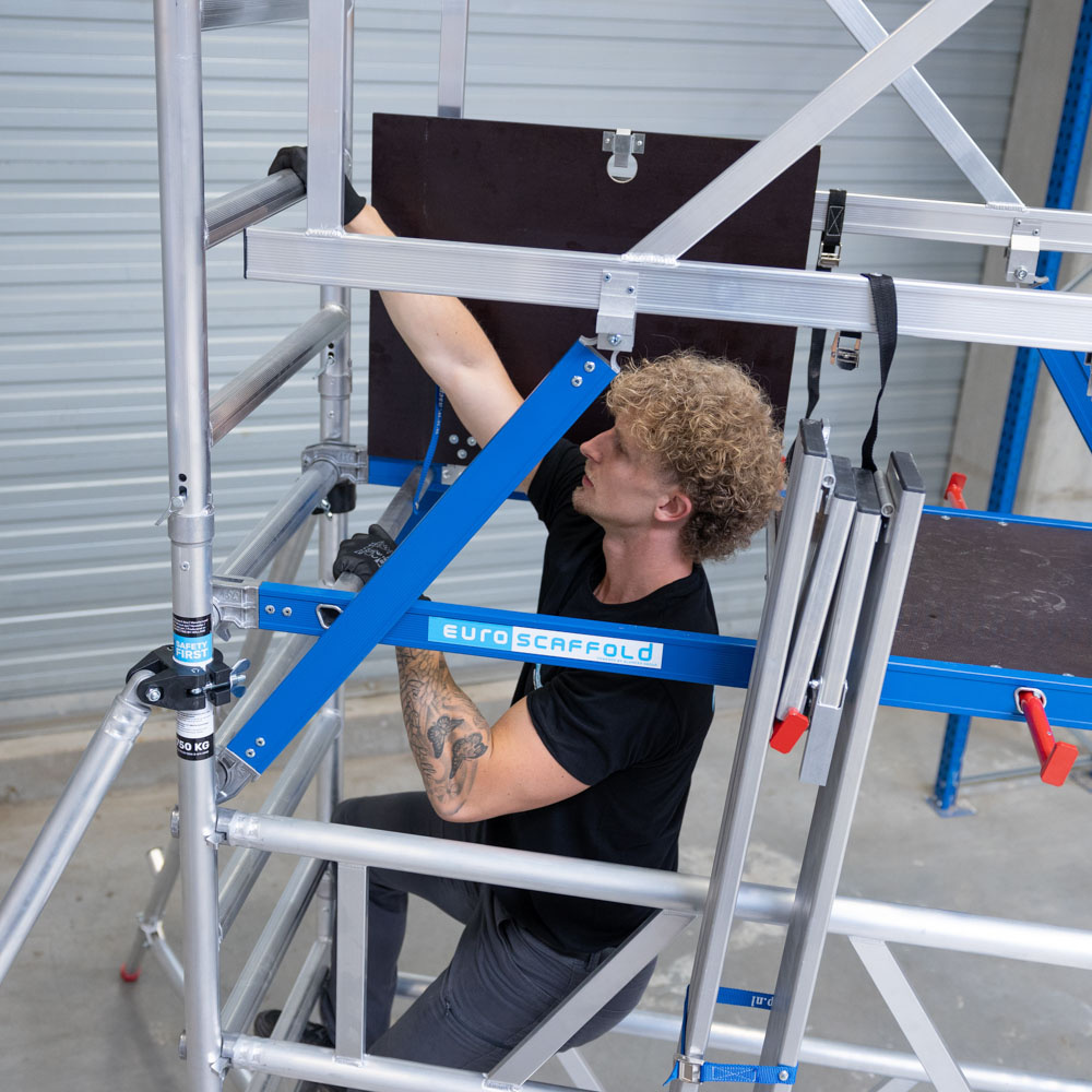 De One XL PRO rolsteiger van Euroscaffold heeft de compacte afmetingen van een One rolsteiger en past hierdoor door een deuropening, handig voor indoor gebruik. Tevens is de steiger voorzien van voorloopleuningen, in bepaalde landen is subsidie mogelijk.