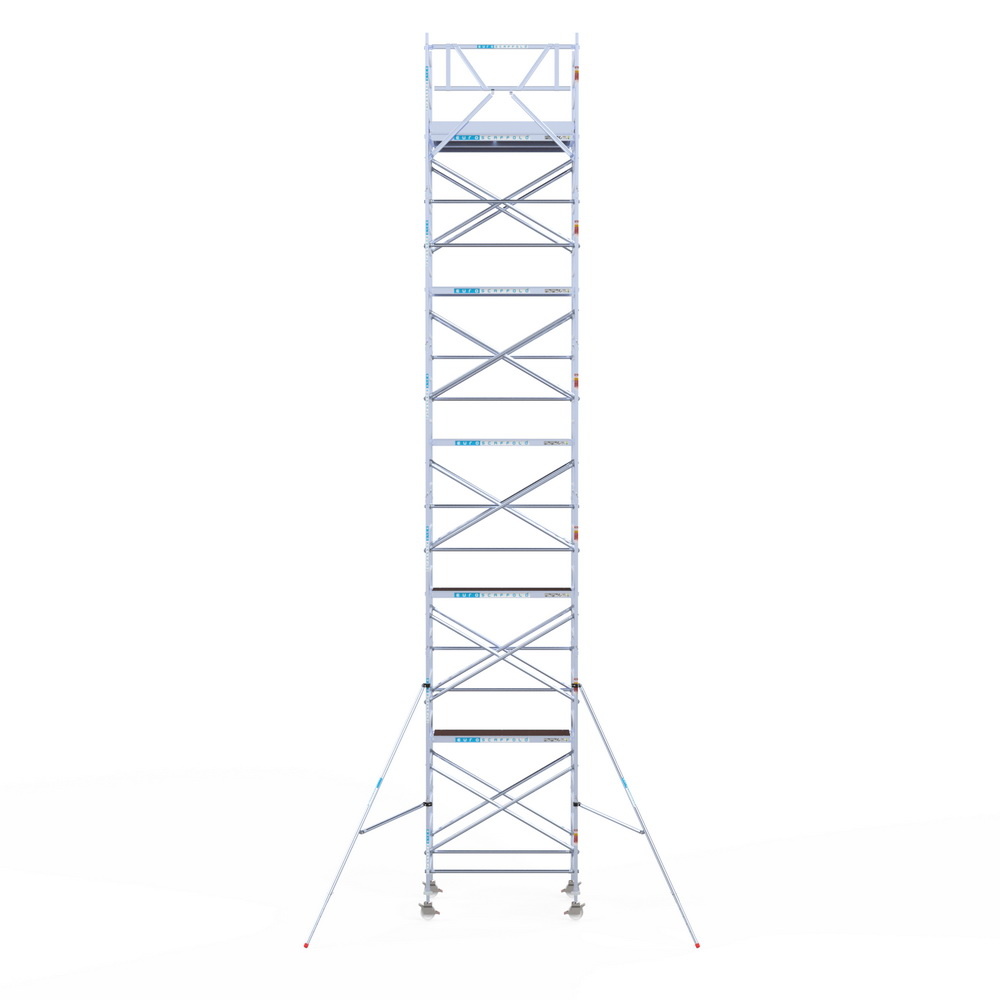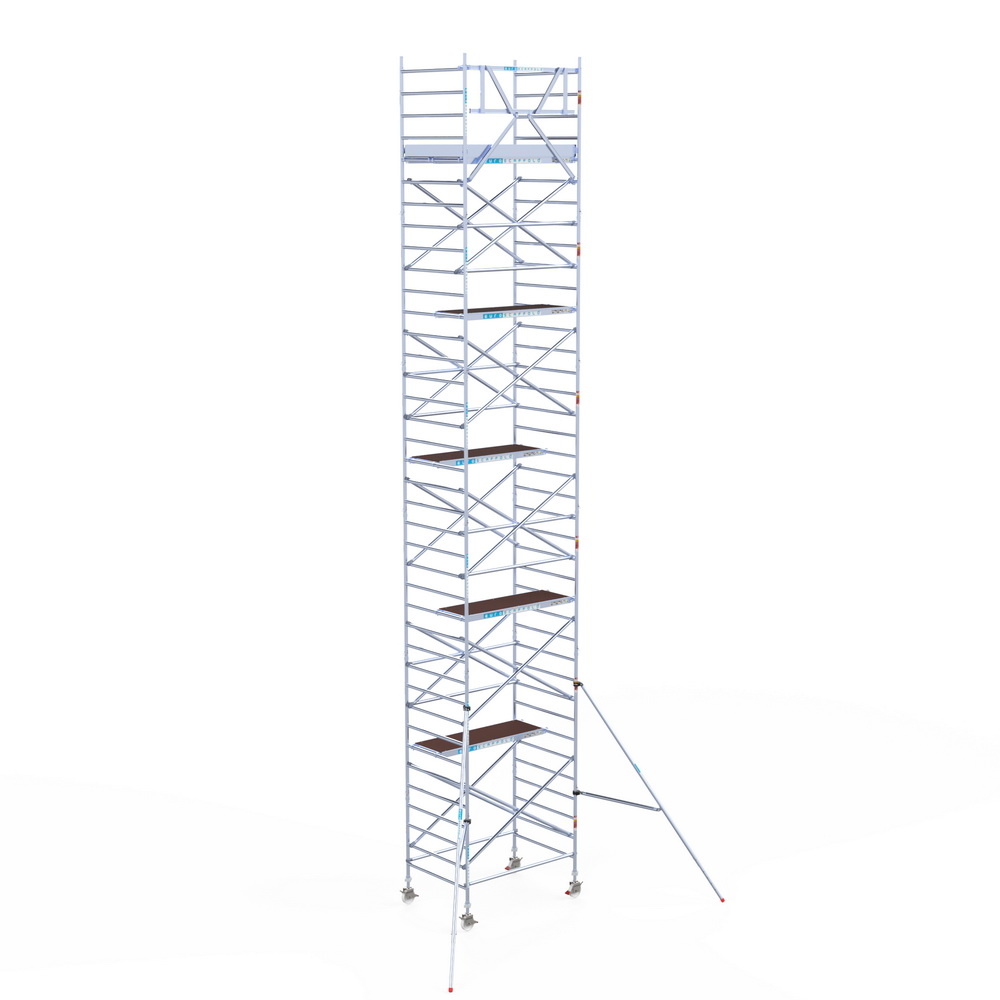 Deze Euroscaffold rolsteiger is in Nederland geproduceerd en heeft een breedte van 135 cm, een lengte van 190 cm en een werkhoogte van 12,2 meter. Dankzij de aluminium buizen zeer licht in gewicht en eenvoudig te verplaatsen.