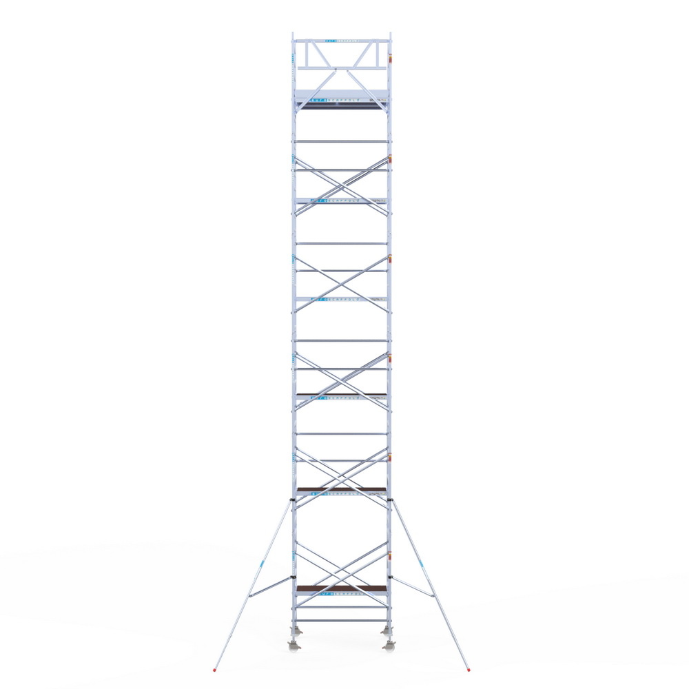 Kies de juiste werkhoogte voor uw rolsteiger. Werkhoogte wordt als volgt berekend: de hoogte van het hoogste platform plus de gemiddelde hoogte van de handen als een persoon met omhoog gestrekte armen werkt (hiervoor rekenen we 2 meter). De formule om de werkhoogte te berekenen is dus: platformhoogte + 2 meter.