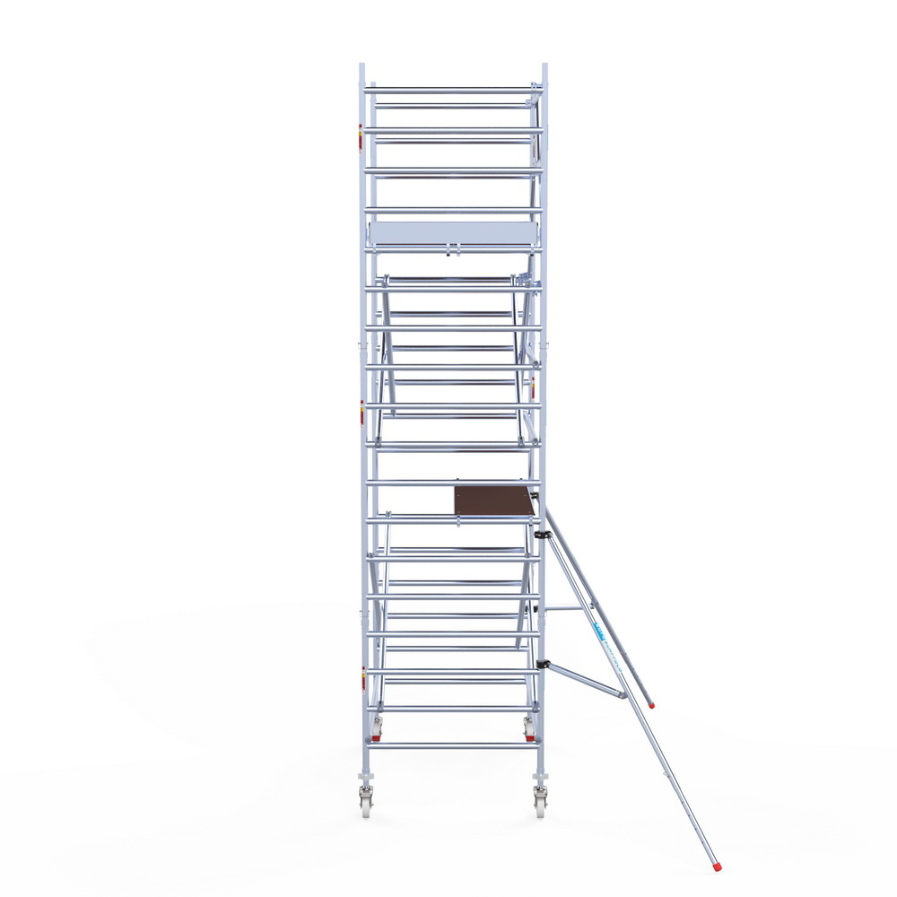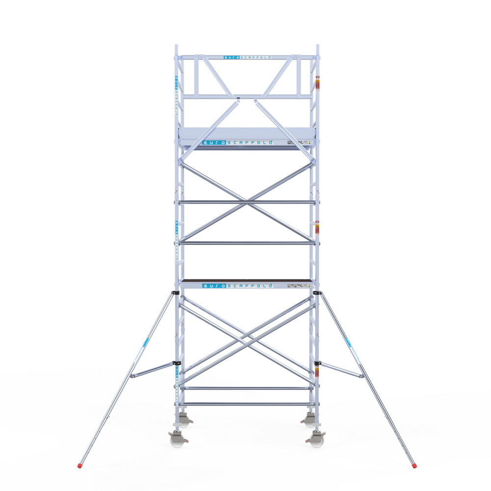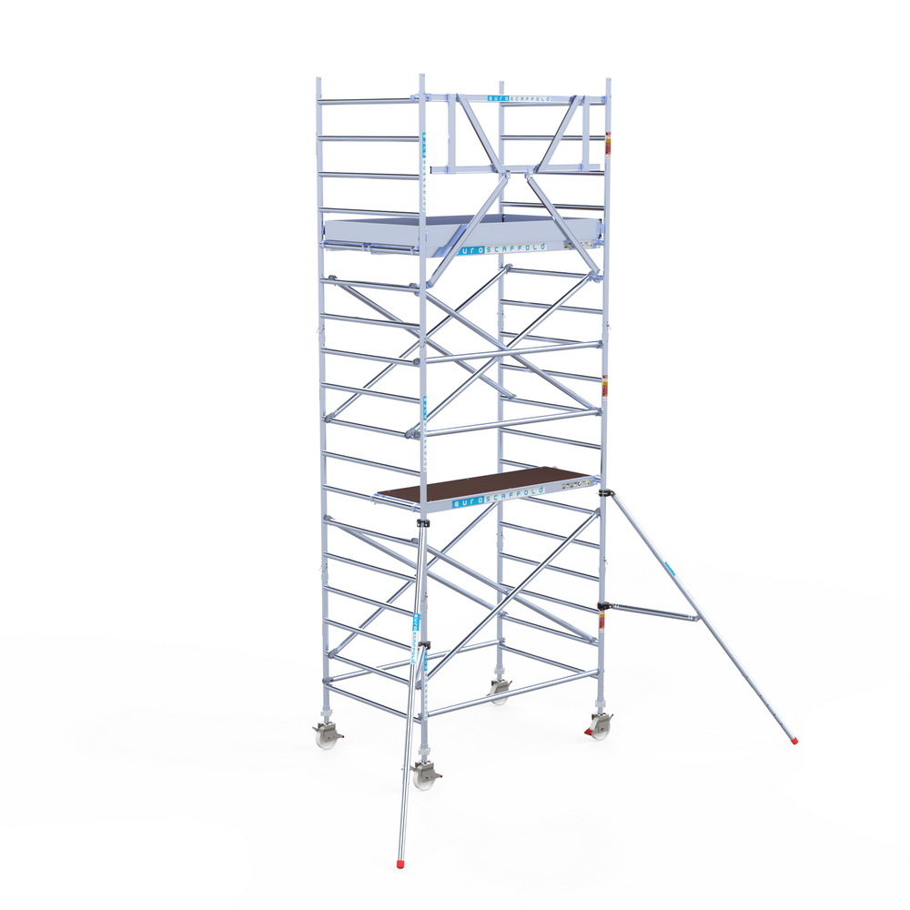 Deze populaire Euroscaffold rolsteiger heeft een breedte van 135 cm, een lengte van 190 cm en een werkhoogte van 6,2 meter. Compacte lengte en toch extra breedte. Ideaal voor de meest uiteenlopende professionele klussen tegen een muur of gevel.