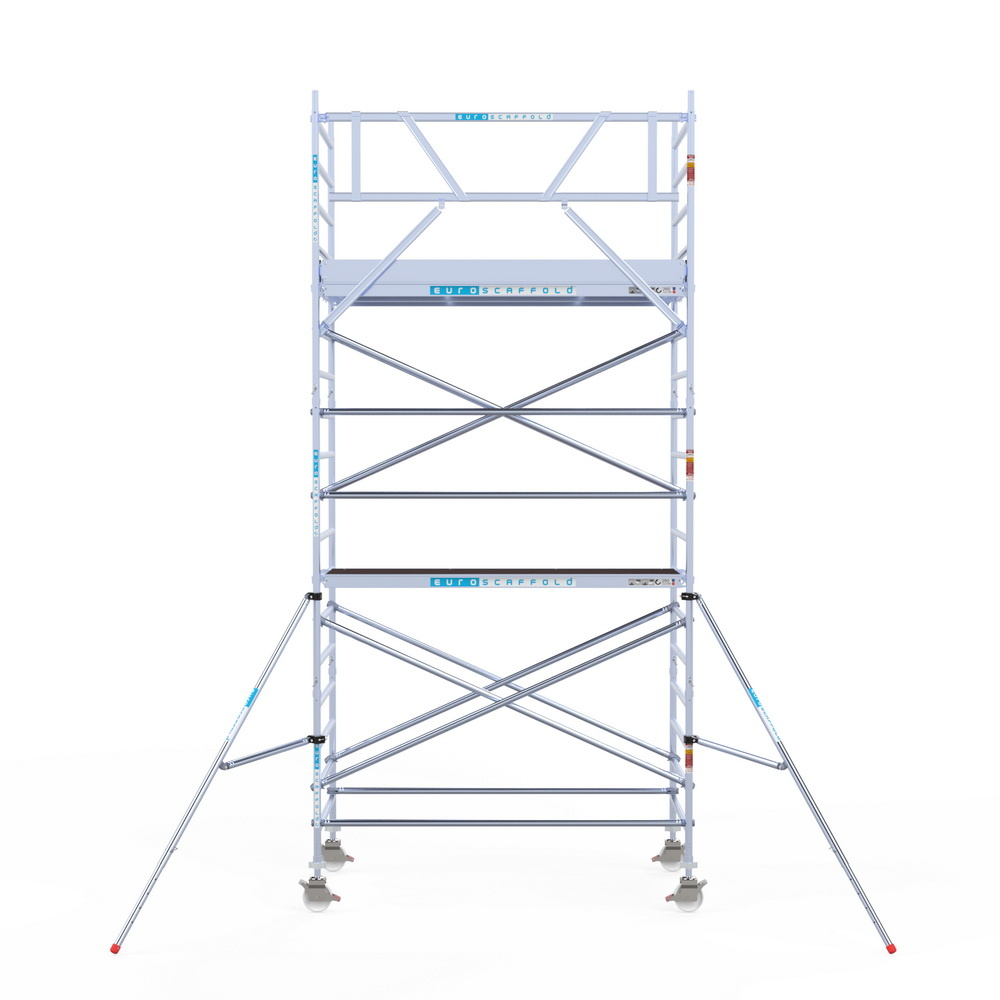Euroscaffold rolsteiger met carbon vloer op de platforms. Deze rolsteiger heeft een breedte lengte van 135 cm, een breedte van 250 cm en een werkhoogte van 6,2 m. Door het gebruiksgemak en de lange levensduur staat deze aluminium rolsteiger sterk.