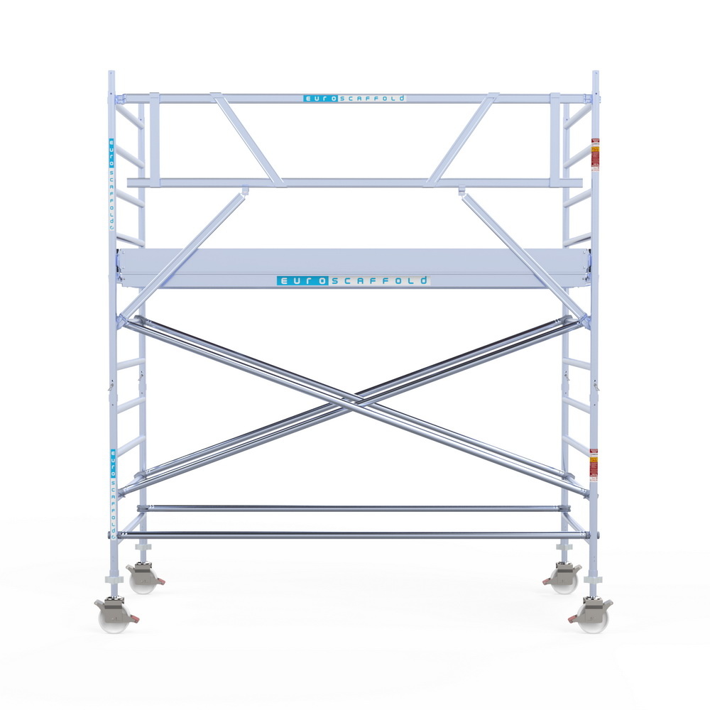Rolsteiger extra breed met 2 lichtgewicht carbon steigervloeren naast elkaar. Superhandig voor het opbouwen van de steiger, evenals de voorloopleuning bovenin de steiger. Zeer goede prijs-/kwaliteit en 5 jaar garantie. Rolsteiger van Nederlandse bodem.