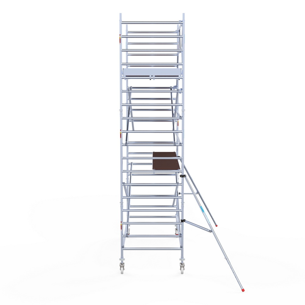 Kies de juiste werkhoogte voor uw rolsteiger. Werkhoogte wordt als volgt berekend: de hoogte van het hoogste platform plus de gemiddelde hoogte van de handen als een persoon met omhoog gestrekte armen werkt (hiervoor rekenen we 2 meter). De formule om de werkhoogte te berekenen is dus: platformhoogte + 2 meter.