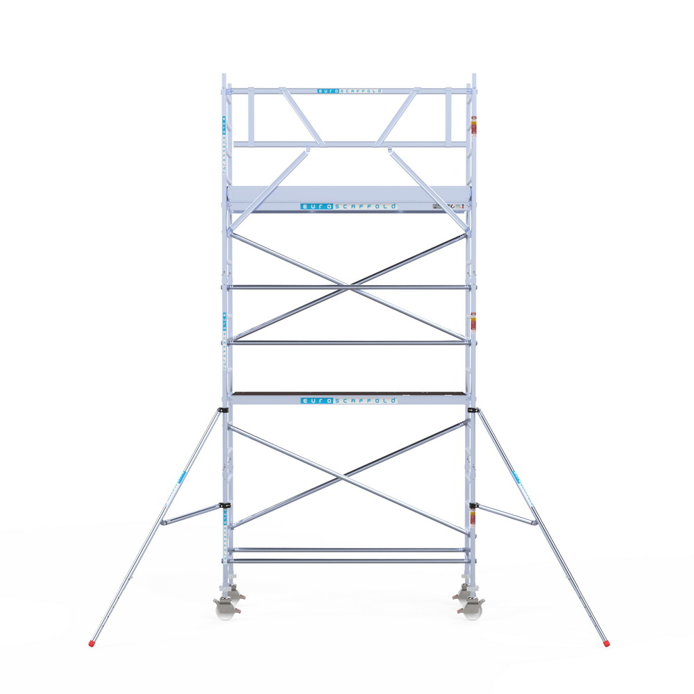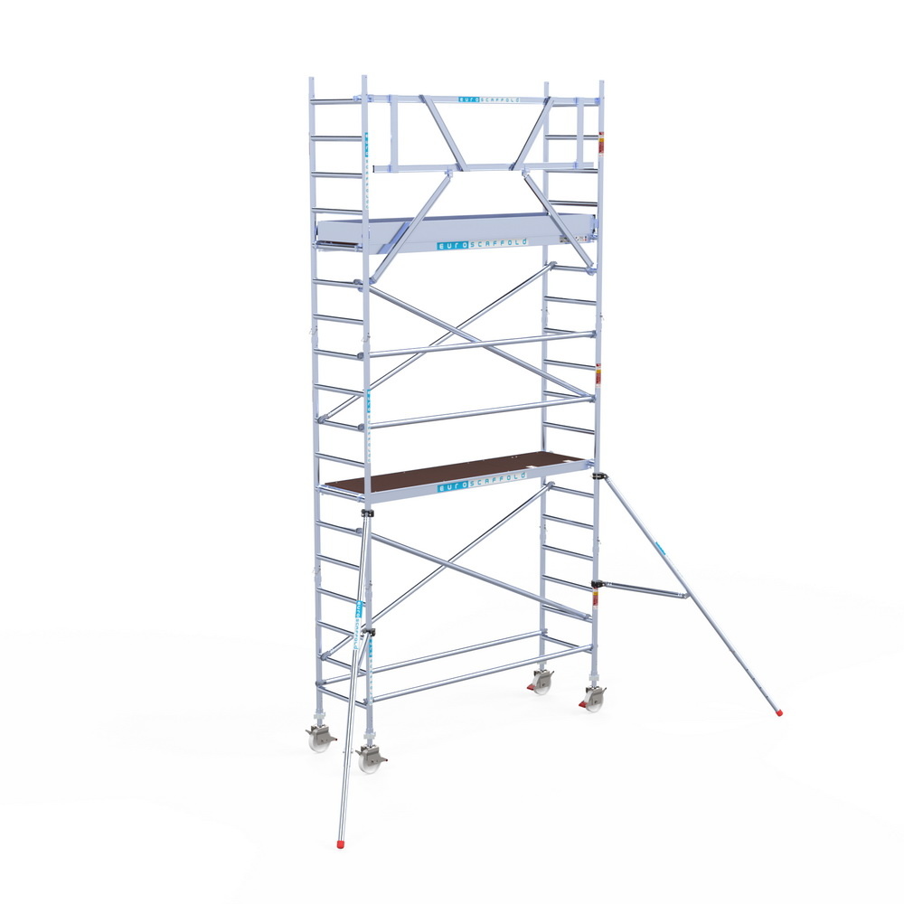 Euroscaffold rolsteiger met een breedte van 75 cm, een lengte van 250 cm en een werkhoogte van 6,2 meter. Binnen een paar minuten opgebouwd en zeer gebruiksvriendelijk. Ideaal voor allerlei klussen aan bijvoorbeeld een gevel.