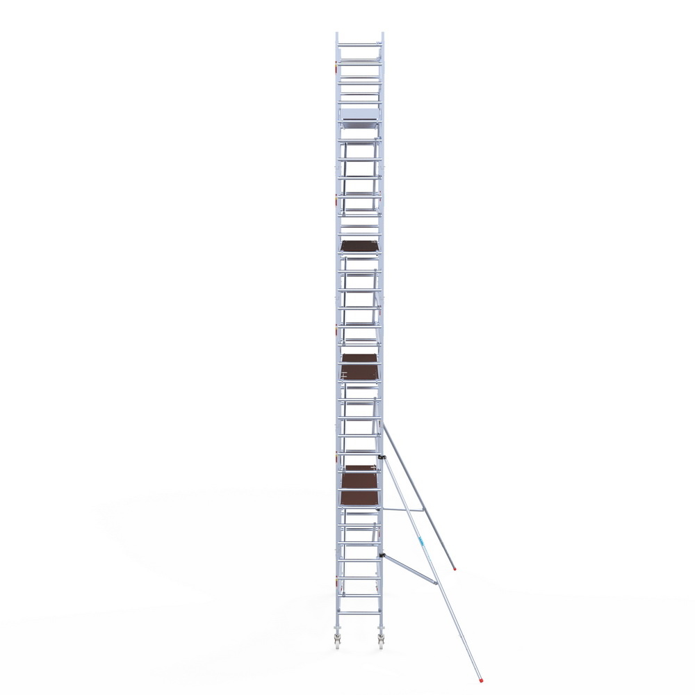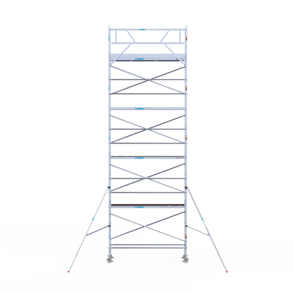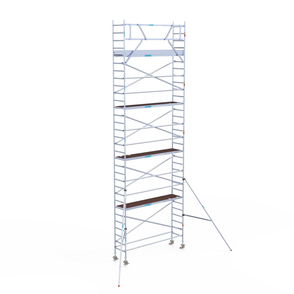 Een Euroscaffold rolsteiger met een breedte van 75 cm, een lengte van 305 cm en een werkhoogte van 10,2 meter. Door de extra lengte is het mogelijk om met meerdere personen tegelijk te werken. Voldoet aan alle wettelijke eisen voor werken tegen de gevel.
