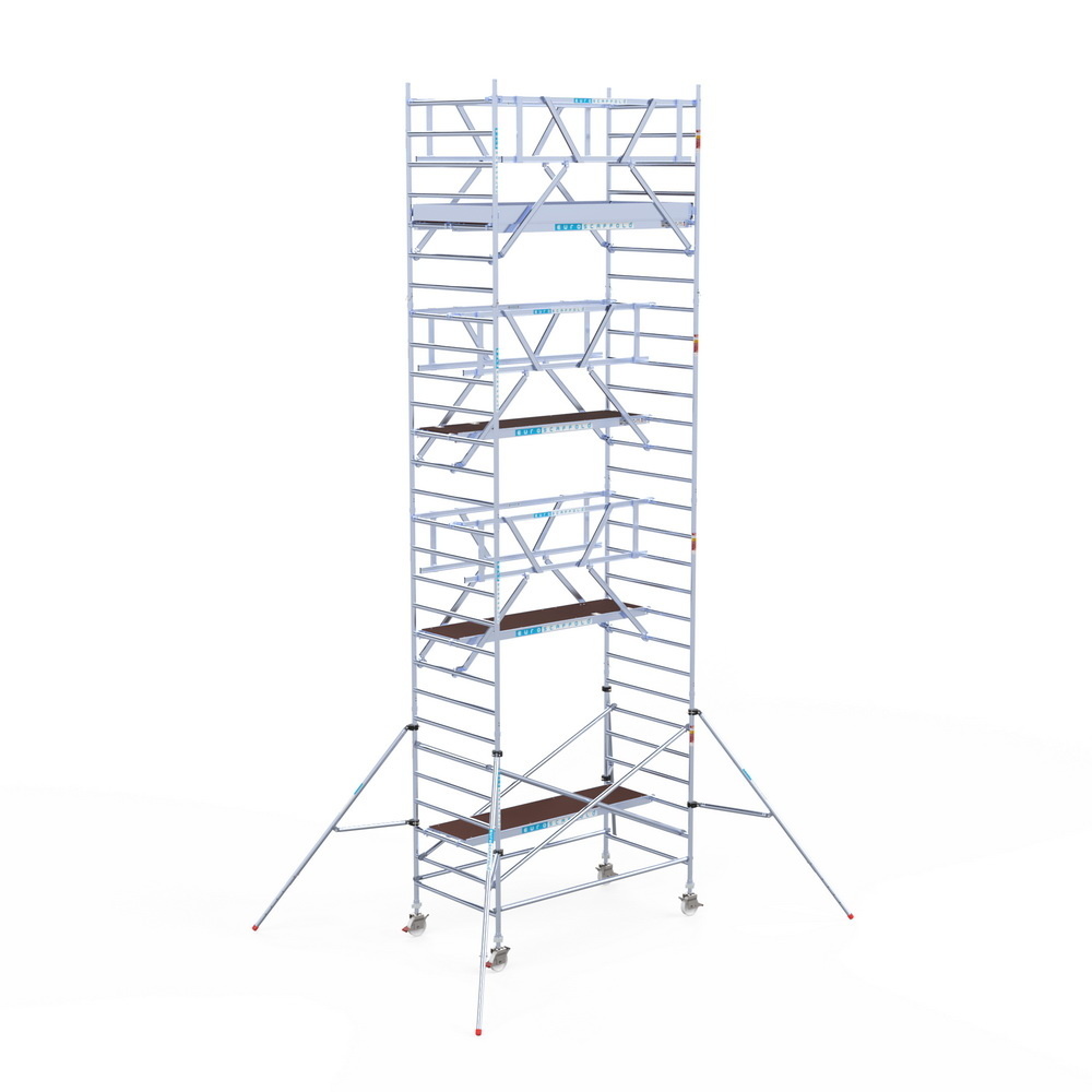 Veilig opbouwen met de dubbele voorloopleuningen van Euroscaffold. De rolsteiger heeft een breedte van 135 cm, een lengte van 250 cm en een werkhoogte van 9,2 meter. Voor dagelijks en professioneel gebruik. Geleverd met 4 carbon platformvloeren.