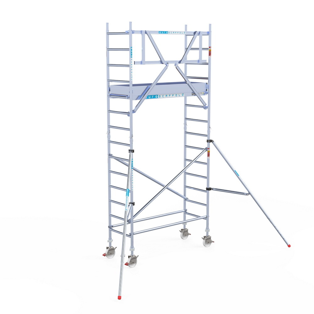 Euroscaffold rolsteiger met enkele voorloopleuning. De rolsteiger heeft een breedte van 75 cm, een lengte van 190 cm en een werkhoogte van 5,2 meter. Voor alle soorten werkzaamheden op hoogte.