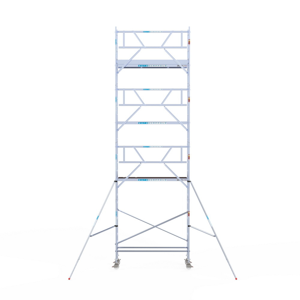 Deze rolsteiger heeft een breedte van 75 cm, een lengte van 250 cm en een werkhoogte van 9,2 meter. De werkhoogte berekenen we als volgt: hoogste platformhoogte + 2 meter (dit is de lengte van de gemiddelde persoon met de armen omhoog gestrekt).