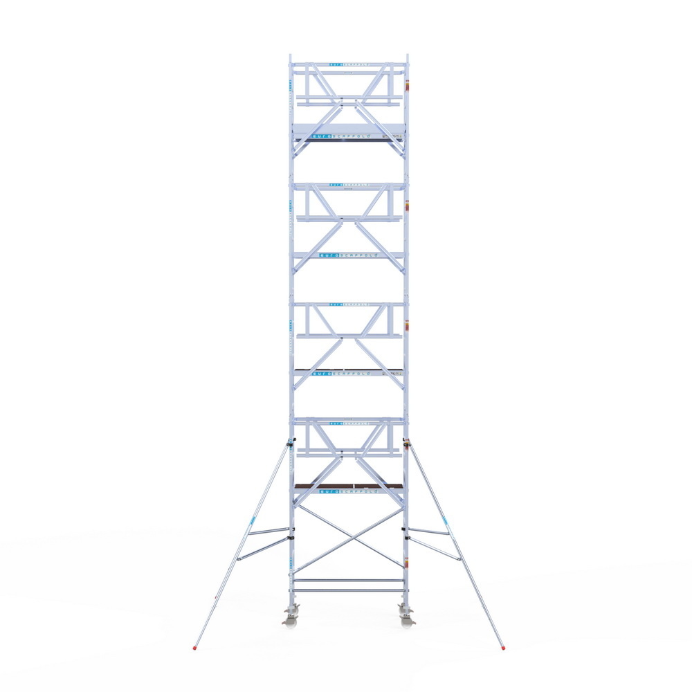 Euroscaffold rolsteiger met lichtgewicht vloeren. Deze steiger voldoet aan de norm van 1 januari 2018 waarbij leuningen op heuphoogte verplicht zijn voor het betreden van het steigerplatform. De rolsteiger beschikt over dubbelzijdige voorloopleuningen.