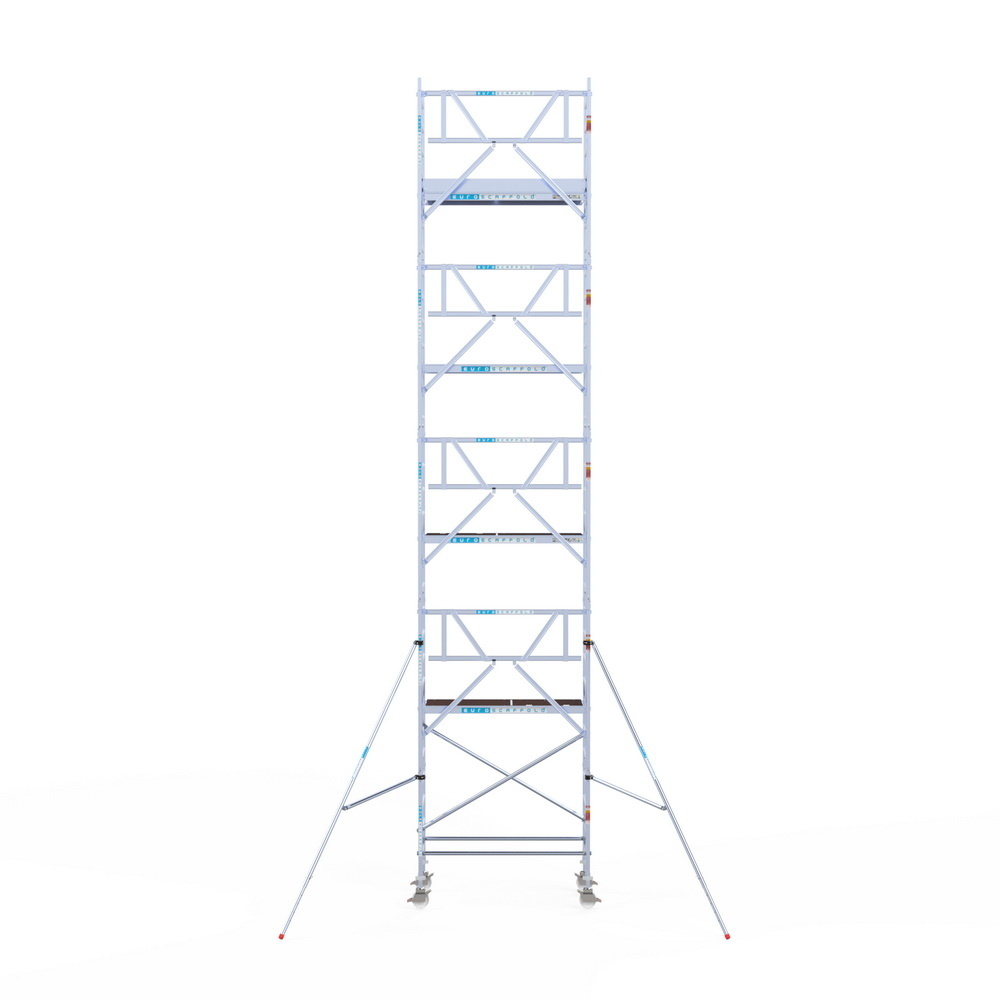 Euroscaffold rolsteiger met lichtgewicht vloeren. Deze steiger voldoet aan de norm van 1 januari 2018 waarbij leuningen op heuphoogte verplicht zijn voor het betreden van het steigerplatform. De rolsteiger beschikt over enkelzijdige voorloopleuningen.