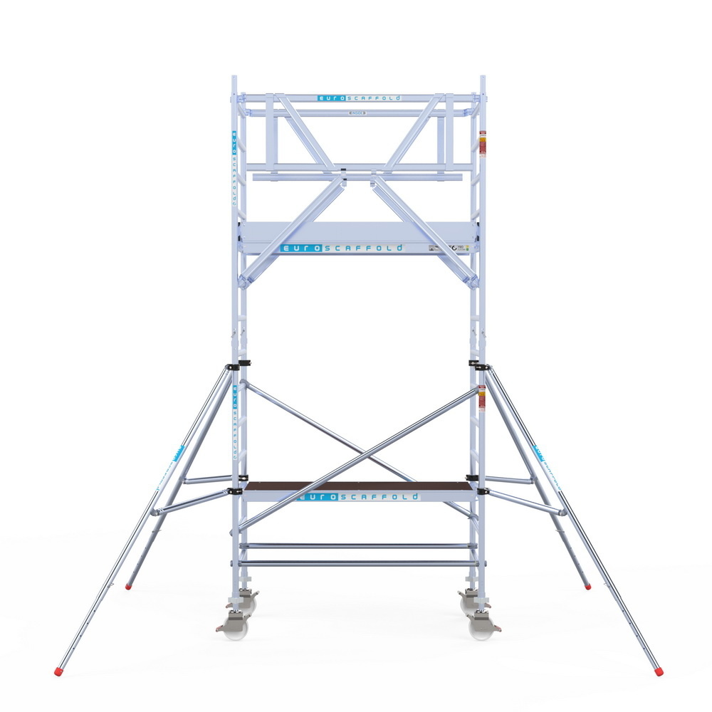 Rolsteiger van het Nederlandse merk Euroscaffold. Deze steiger voldoet aan de norm van 1 januari 2018 waarbij leuningen op heuphoogte verplicht zijn voor het betreden van het steigerplatform. De rolsteiger beschikt over dubbelzijdige voorloopleuningen.