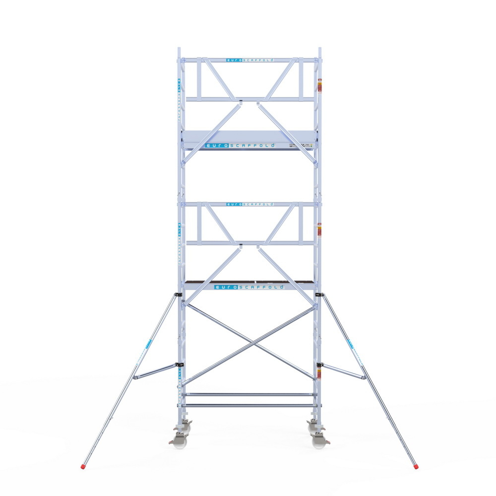 Rolsteiger van het Nederlandse merk Euroscaffold. Deze steiger voldoet aan de norm van 1 januari 2018 waarbij leuningen op heuphoogte verplicht zijn voor het betreden van het steigerplatform. De rolsteiger beschikt over enkelzijdige voorloopleuningen.