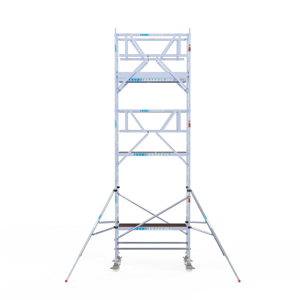 Rolsteiger van het Nederlandse merk Euroscaffold. Deze steiger voldoet aan de norm van 1 januari 2018 waarbij leuningen op heuphoogte verplicht zijn voor het betreden van het steigerplatform. De rolsteiger beschikt over dubbelzijdige voorloopleuningen.