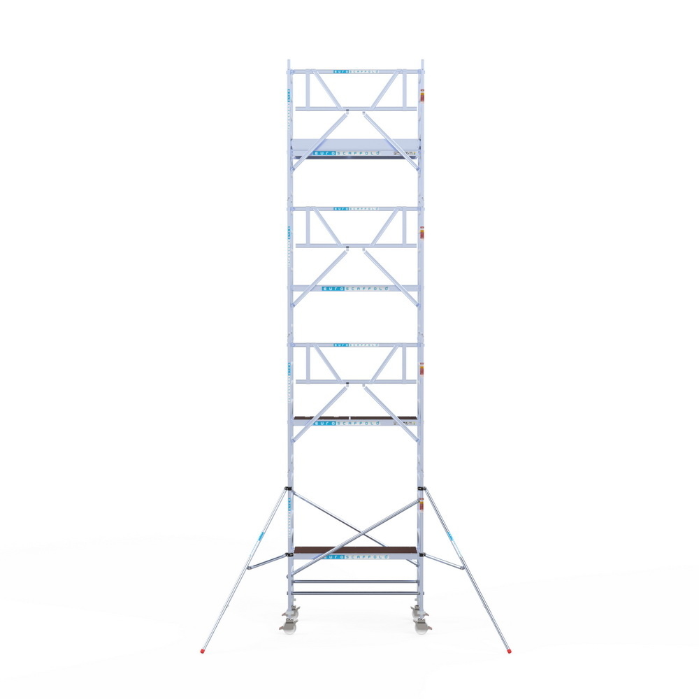 Rolsteiger van het Nederlandse merk Euroscaffold. Deze steiger voldoet aan de norm van 1 januari 2018 waarbij leuningen op heuphoogte verplicht zijn voor het betreden van het steigerplatform. De rolsteiger beschikt over enkelzijdige voorloopleuningen.