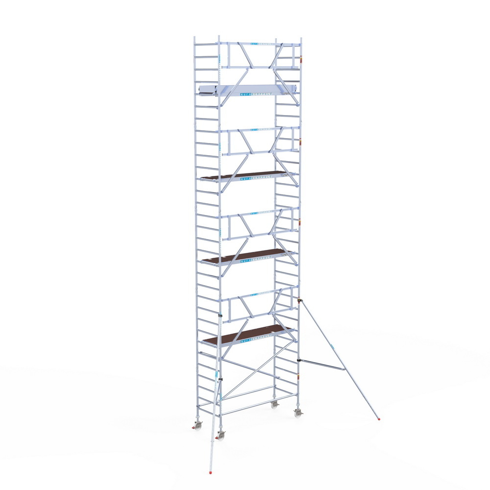 Rolsteiger van het Nederlandse merk Euroscaffold. Deze steiger voldoet aan de norm van 1 januari 2018 waarbij leuningen op heuphoogte verplicht zijn voor het betreden van het steigerplatform. De rolsteiger beschikt over enkelzijdige voorloopleuningen.