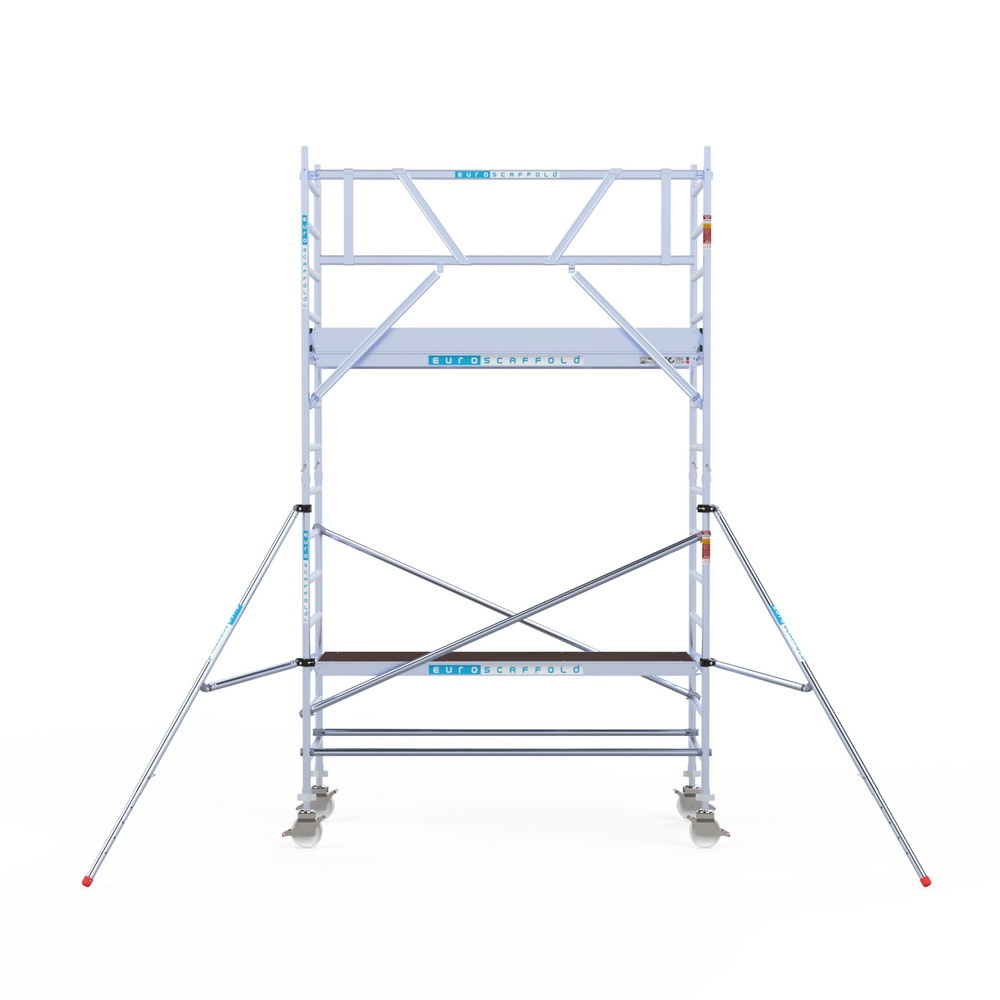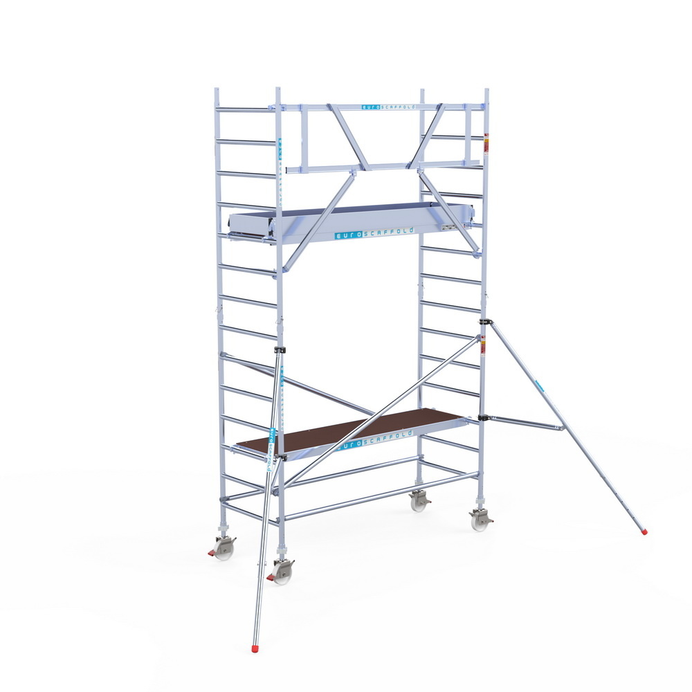 Euroscaffold rolsteiger met lichtgewicht vloeren. Deze steiger voldoet aan de norm van 1 januari 2018 waarbij leuningen op heuphoogte verplicht zijn voor het betreden van het steigerplatform. De rolsteiger beschikt over enkelzijdige voorloopleuningen.