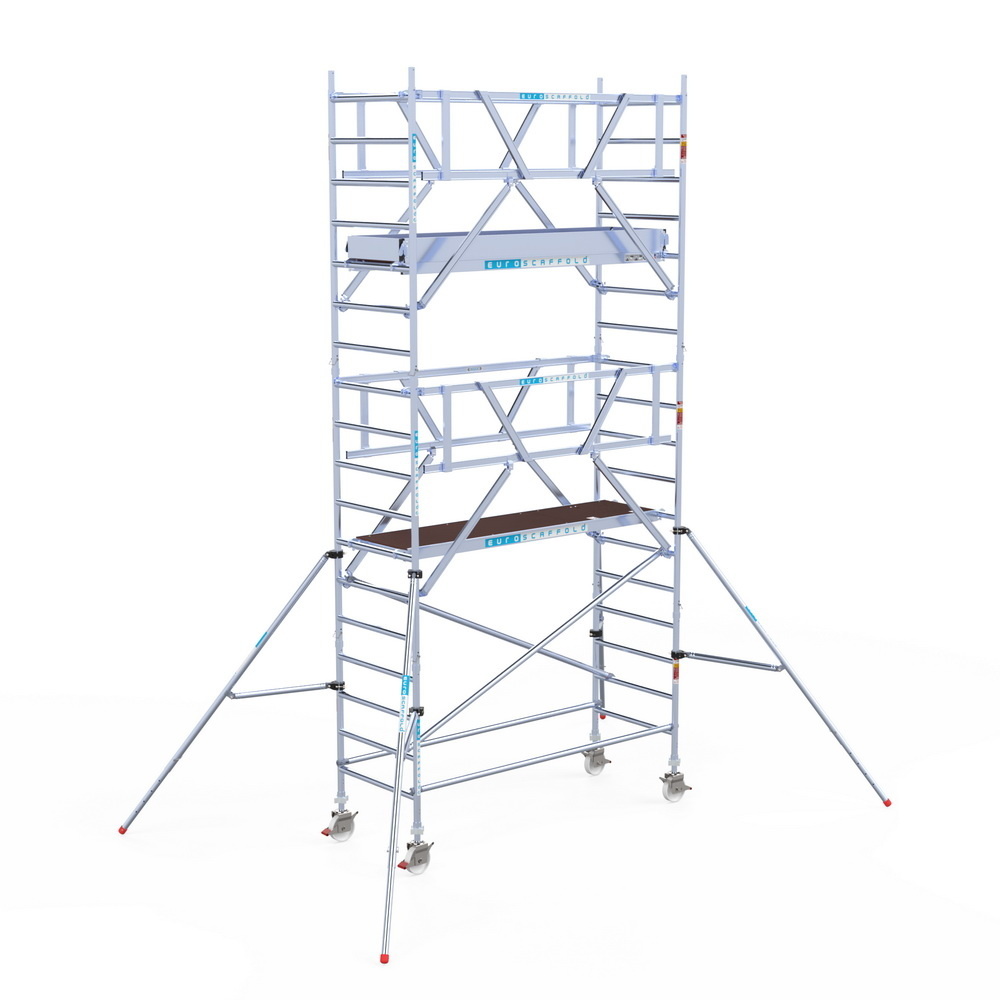 Euroscaffold rolsteiger met lichtgewicht vloeren. Deze steiger voldoet aan de norm van 1 januari 2018 waarbij leuningen op heuphoogte verplicht zijn voor het betreden van het steigerplatform. De rolsteiger beschikt over dubbelzijdige voorloopleuningen.