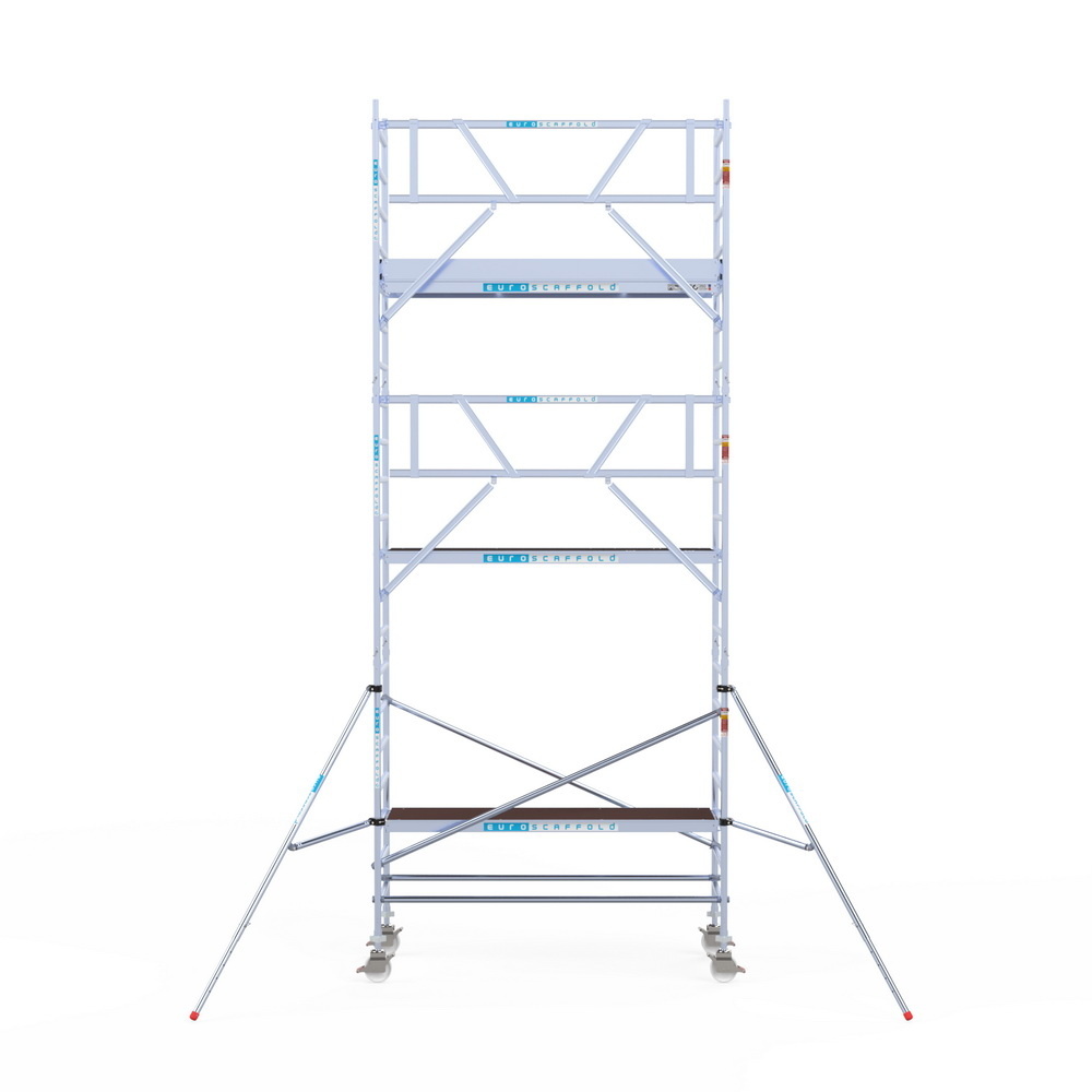 Euroscaffold rolsteiger met lichtgewicht vloeren. Deze steiger voldoet aan de norm van 1 januari 2018 waarbij leuningen op heuphoogte verplicht zijn voor het betreden van het steigerplatform. De rolsteiger beschikt over enkelzijdige voorloopleuningen.