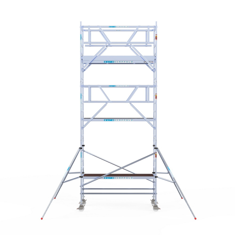 Euroscaffold rolsteiger met lichtgewicht vloeren. Deze steiger voldoet aan de norm van 1 januari 2018 waarbij leuningen op heuphoogte verplicht zijn voor het betreden van het steigerplatform. De rolsteiger beschikt over dubbelzijdige voorloopleuningen.