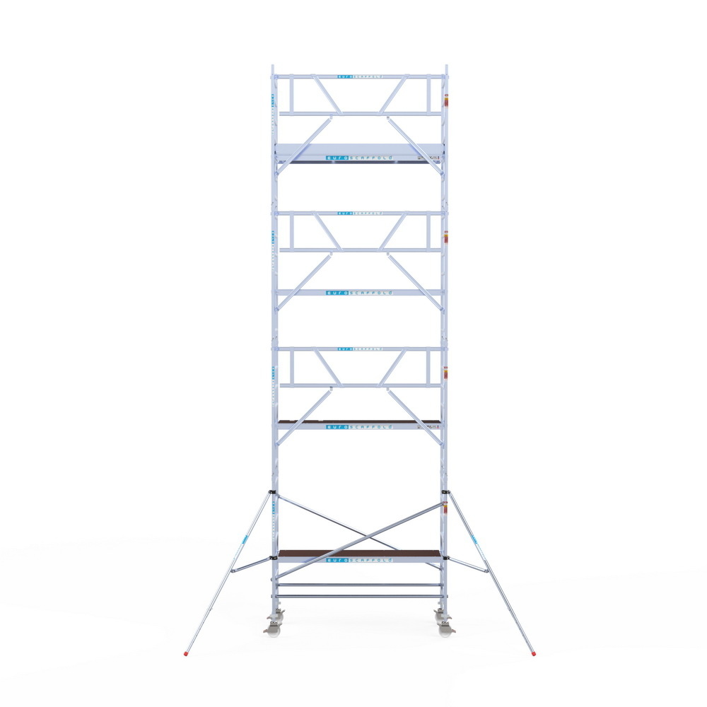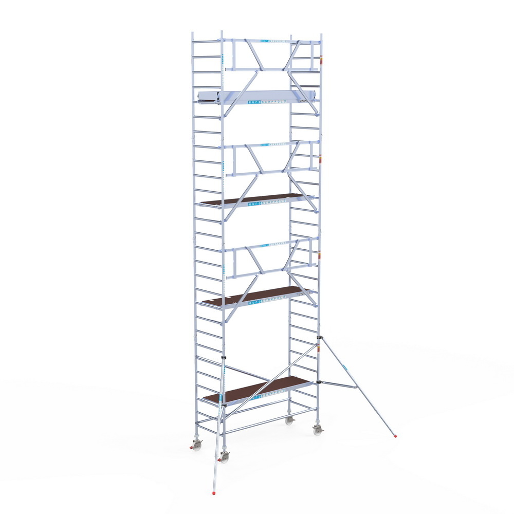 Euroscaffold rolsteiger met lichtgewicht vloeren. Deze steiger voldoet aan de norm van 1 januari 2018 waarbij leuningen op heuphoogte verplicht zijn voor het betreden van het steigerplatform. De rolsteiger beschikt over enkelzijdige voorloopleuningen.