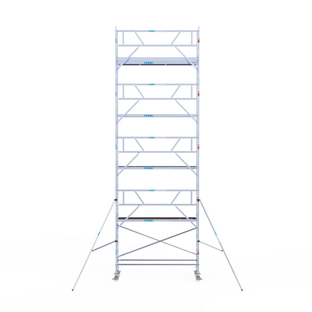 Rolsteiger van het Nederlandse merk Euroscaffold. Deze steiger voldoet aan de norm van 1 januari 2018 waarbij leuningen op heuphoogte verplicht zijn voor het betreden van het steigerplatform. De rolsteiger beschikt over enkelzijdige voorloopleuningen.