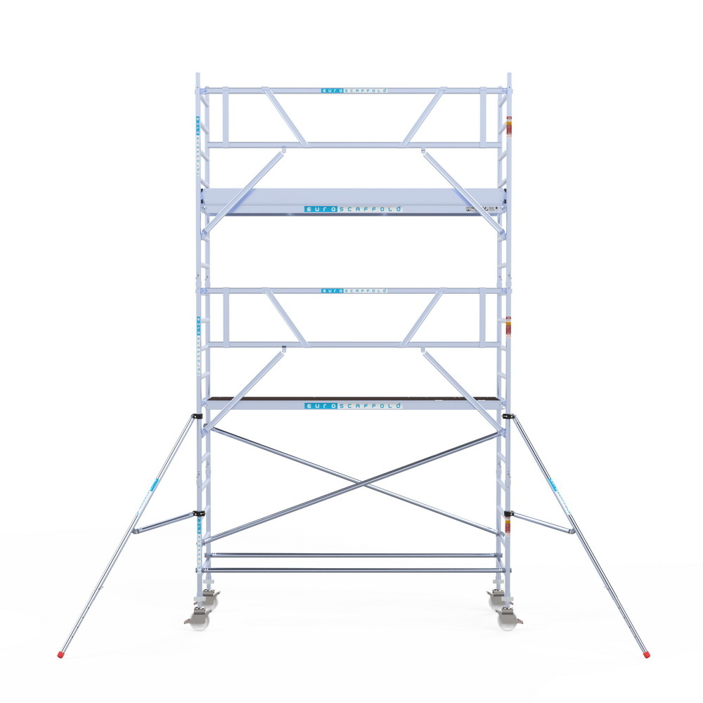 Rolsteiger van het Nederlandse merk Euroscaffold. Deze steiger voldoet aan de norm van 1 januari 2018 waarbij leuningen op heuphoogte verplicht zijn voor het betreden van het steigerplatform. De rolsteiger beschikt over enkelzijdige voorloopleuningen.